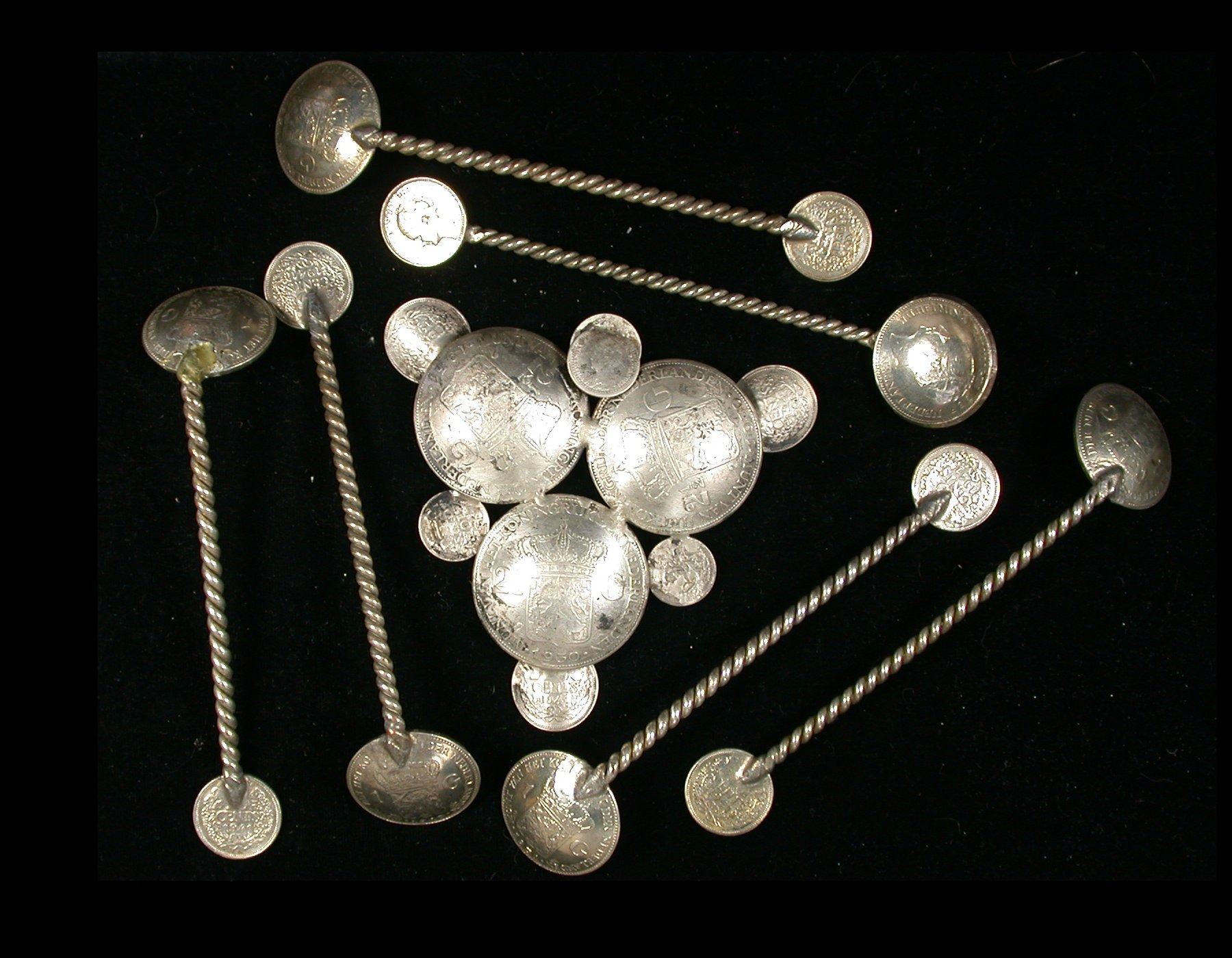 An interesting lot of Dutch Silver Coin spoons, consisting of six pieces with Gulden for a bowl, and Twenty-five Cents forming tip of handle. Offered together with a fairly unique "Coin Ashtray", consisting of 3 X 2.5 Gulden coins attached at edges in a trinity, with three Twenty-five Cent coins folded at top to form cigarette holders, with a further trio of small Ten Cent coins lending further support. With total weight of 200 grams, and estimated net silver content of 4.5 oz