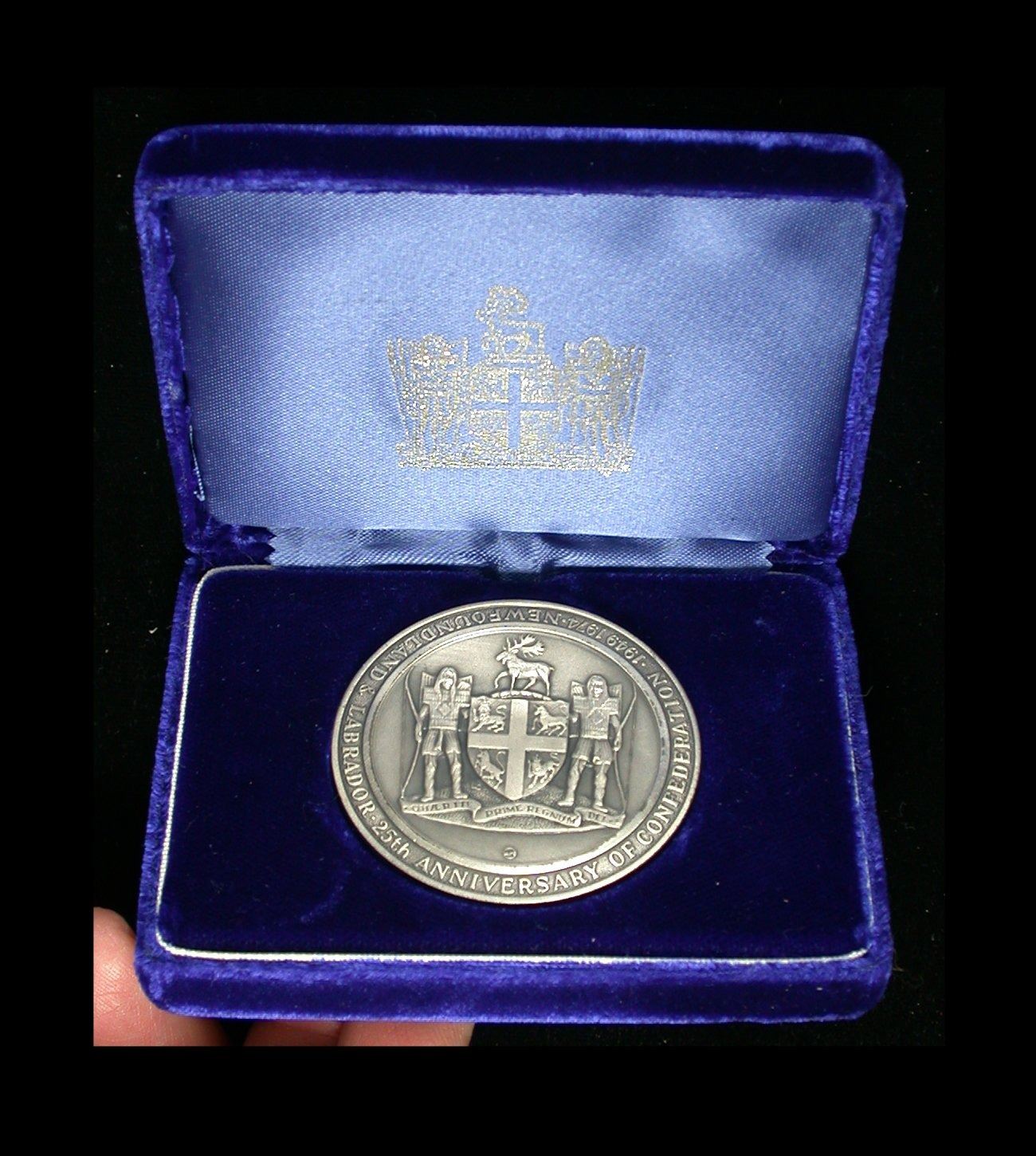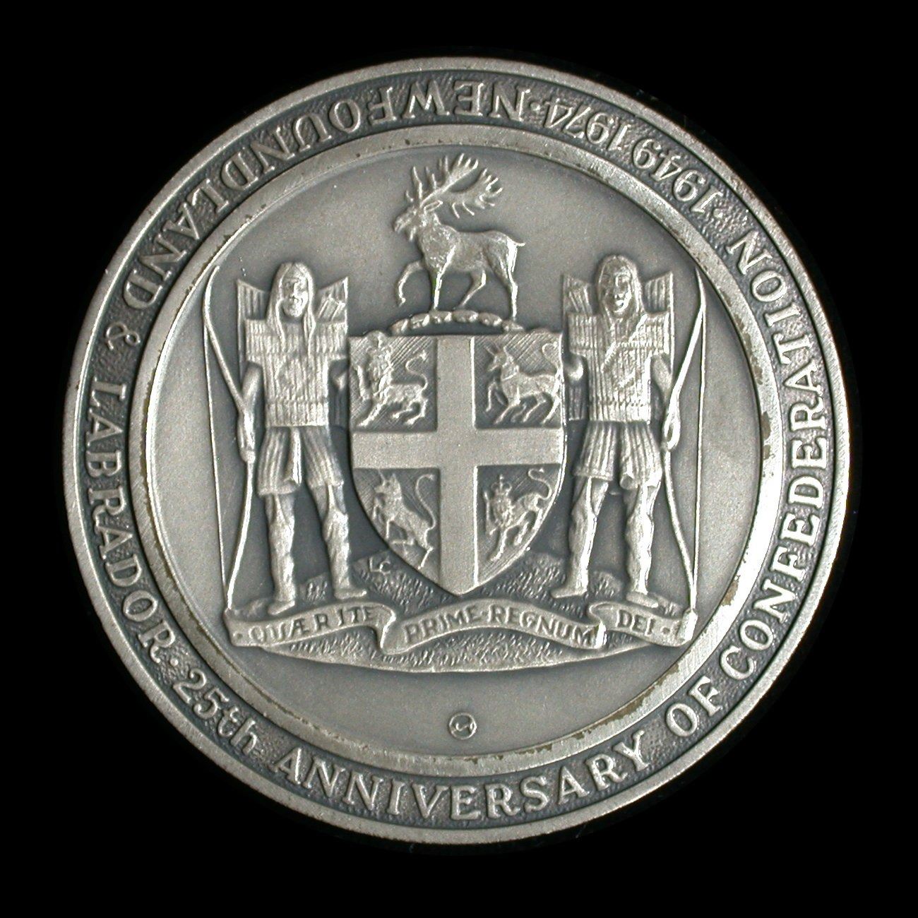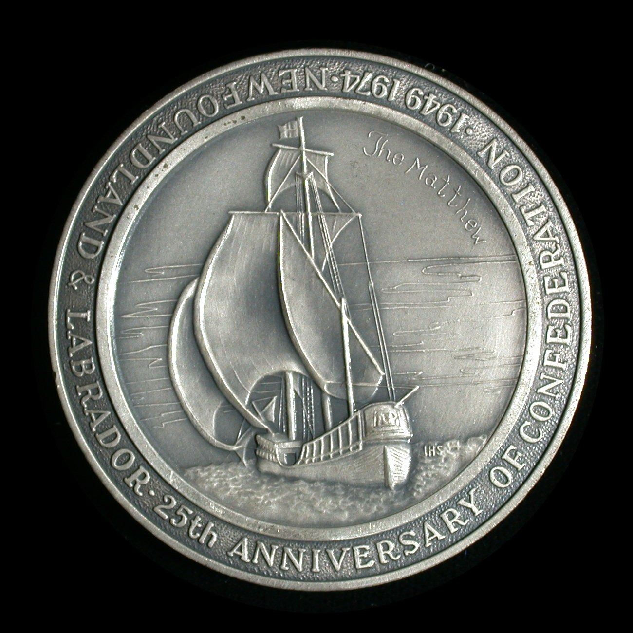 A 51mm, 66.3 gram medal in .999 Silver, struck by the Wellings Mint in 1974 to mark the 25th anniversary of the entrance of Newfoundland into Confederation. With attractive antiqued matte finish, Obv: Matthew saiing ship at center, text around outer circumference: "Newfoundland & Labrador 25th Anniversary of Confederation 1949-1974"; Rev: large Provincial seal ast center, identical circumference text as obverse. With net silver content of 2.13 oz, housed in original plush box of issue with provinicial seal on inner satin lining. (This item is HST exempt)
