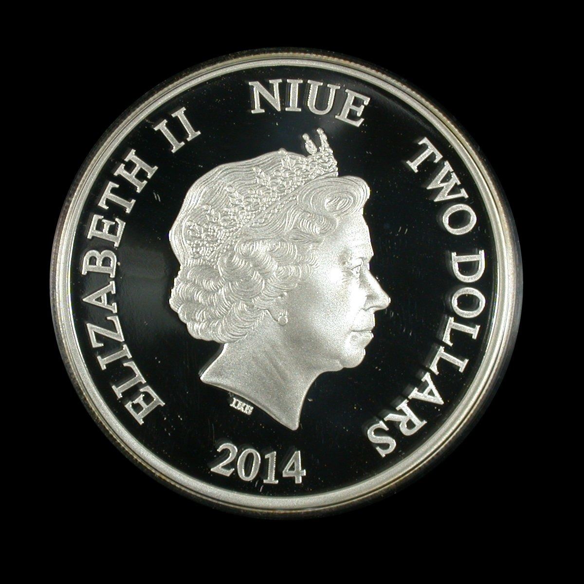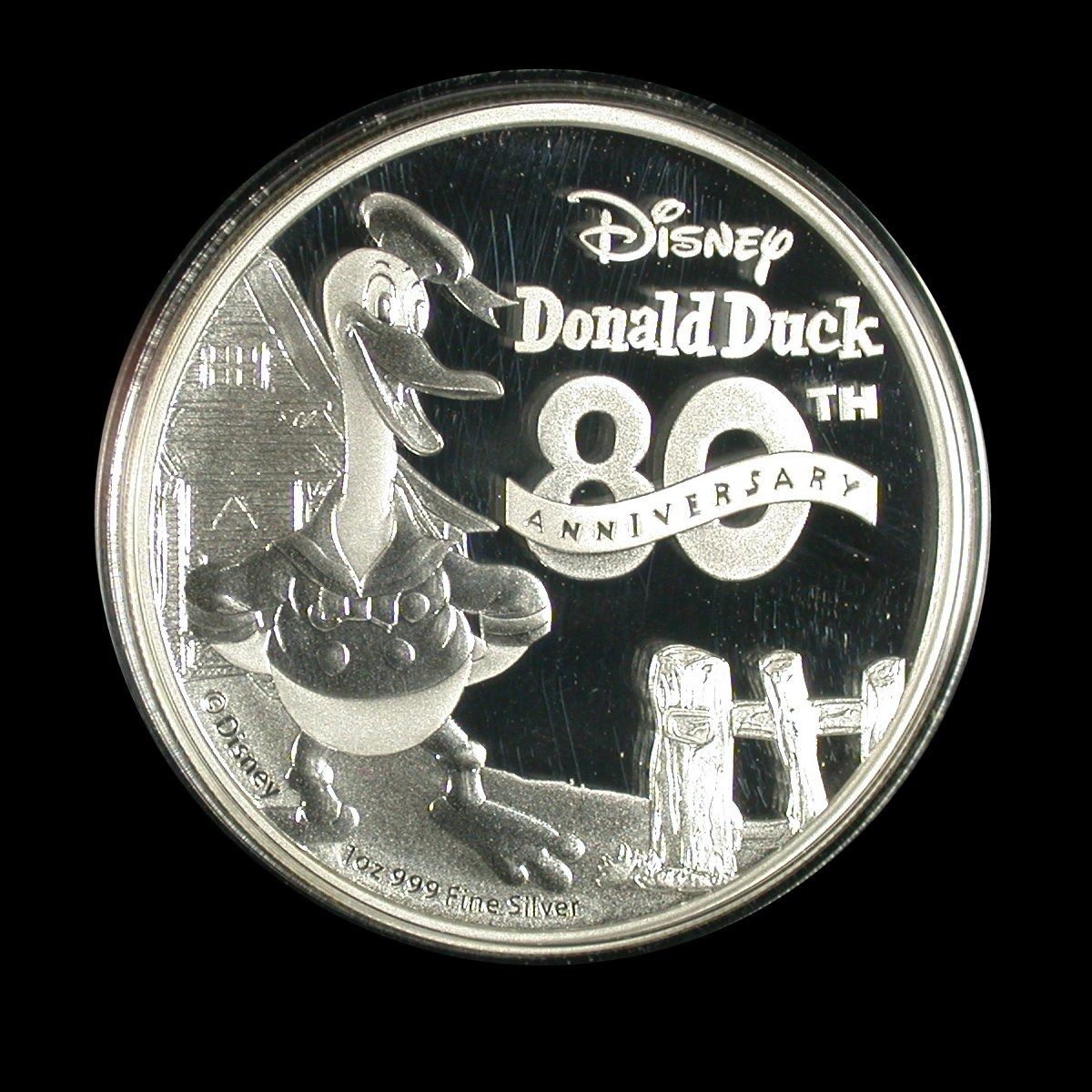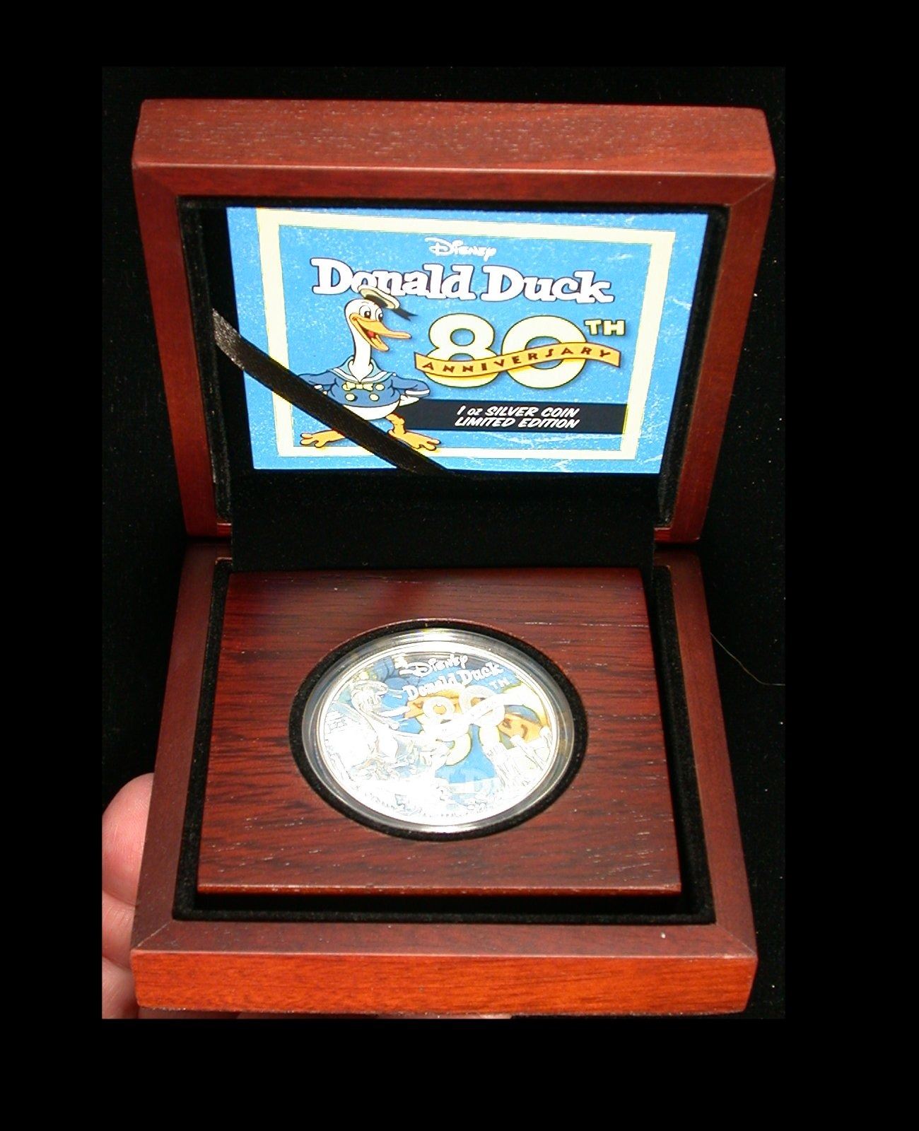 From the New Zealand Mint, a Proof 2014 Two Dollar coin struck for the island nation of Niue, commememorating the 80th anniversary of Disney's Donald Duck. Containing one ounce of .999 Silver, with classic original Donald Duck on reverse from his debut film appearance in 1934. Housed in nice wooden case of issue, with detailed certificate. (This item is HST Exempt)