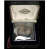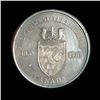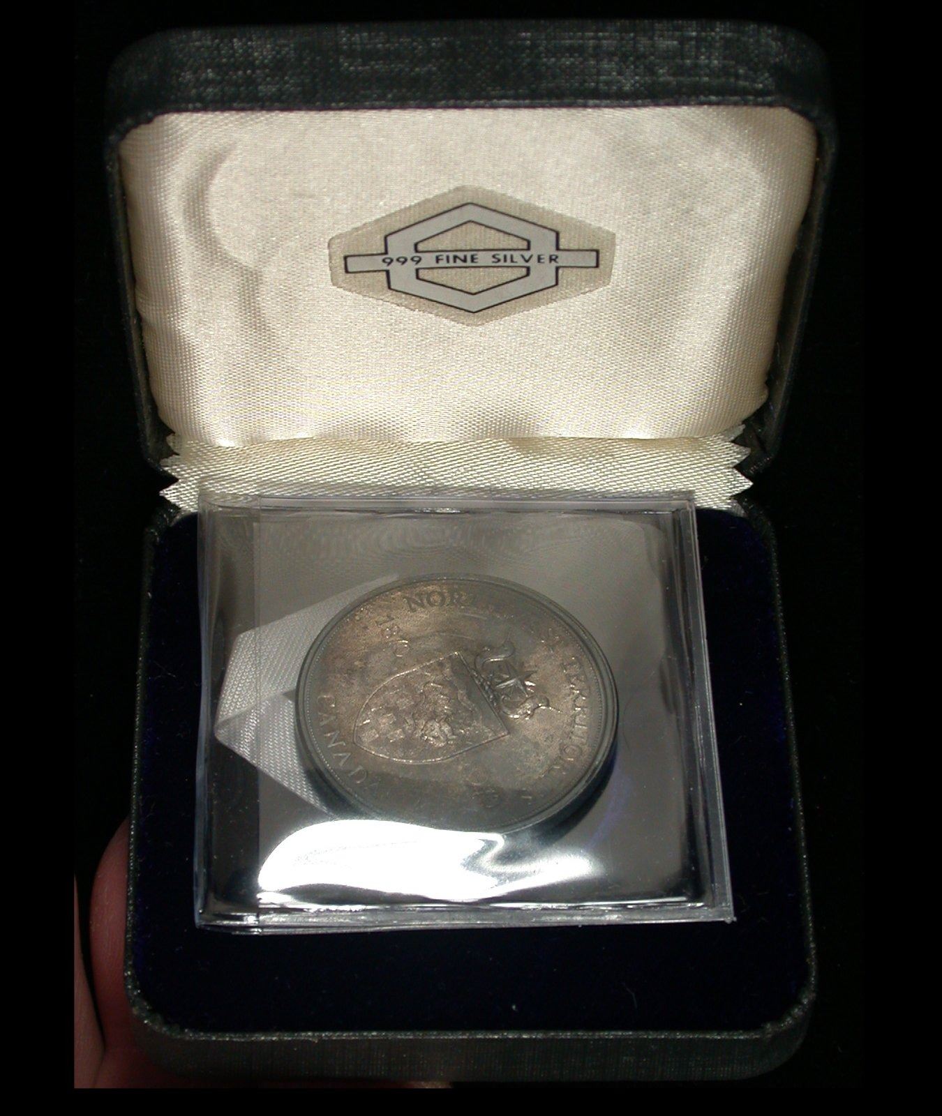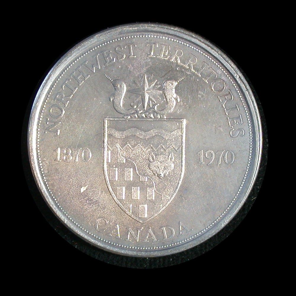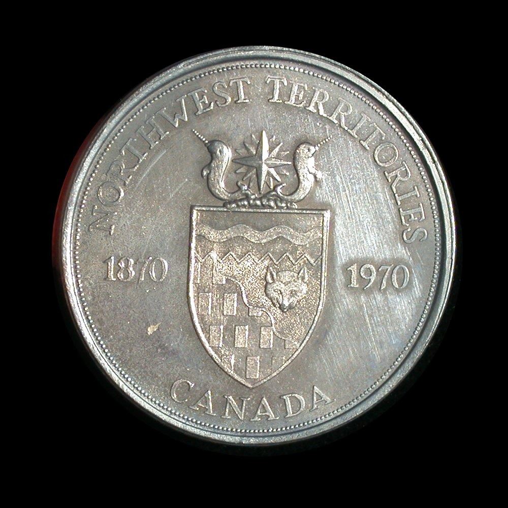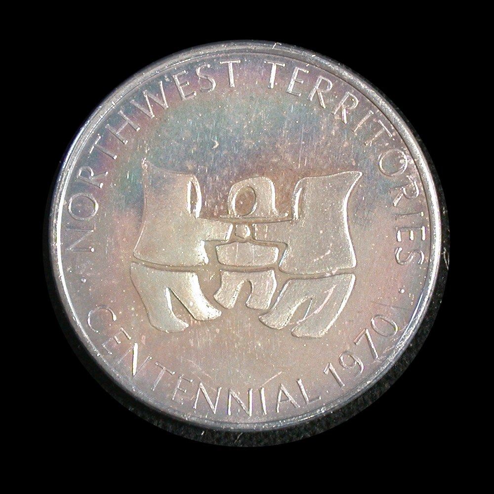 A 32mm, 16.5 gram medalion in .999 Silver, struck to commemorate the centennial of the Northwest Territories in 1970. Reverse: trio of inuit facing each other, arms extended, text around circumference: "Northwest Territories Centennial 1970"; Obv: NWT shield at center, "1870 / 1970" to left and right, "Northwest Territories" above, "Canada" below. In original black box of issue with blue plush interior, and ".999 Fine Silver" label on inner satin lid; medal shows slight cabinet friction, and has now tond in a nice blue-gold hue. The first silver striking of this medal we have handled. (This item is HST exempt)