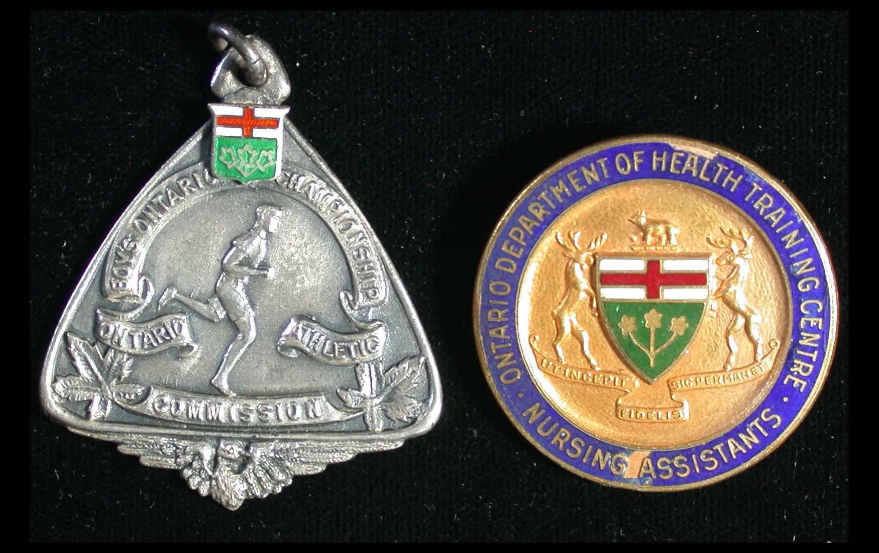 A pair of Ontario medals, as follows: a 38mm triangular medal in Sterling Silver by Ellis Brothers, issued for the Boy's Ontario Athletic Championship, with small enamelled Ontario crest at top; offered together with a 33m round "Nursing Assistants" pin-on badge in gold fill, issued by the Ontario Department of Health Training Centre; back blank (other than "Ellis" imprint, front has small enamelled Ontario crest at center, and raised ring around circumference in blue enamelling (two minor spots of damage to this enamelling). (Lot of two medals)