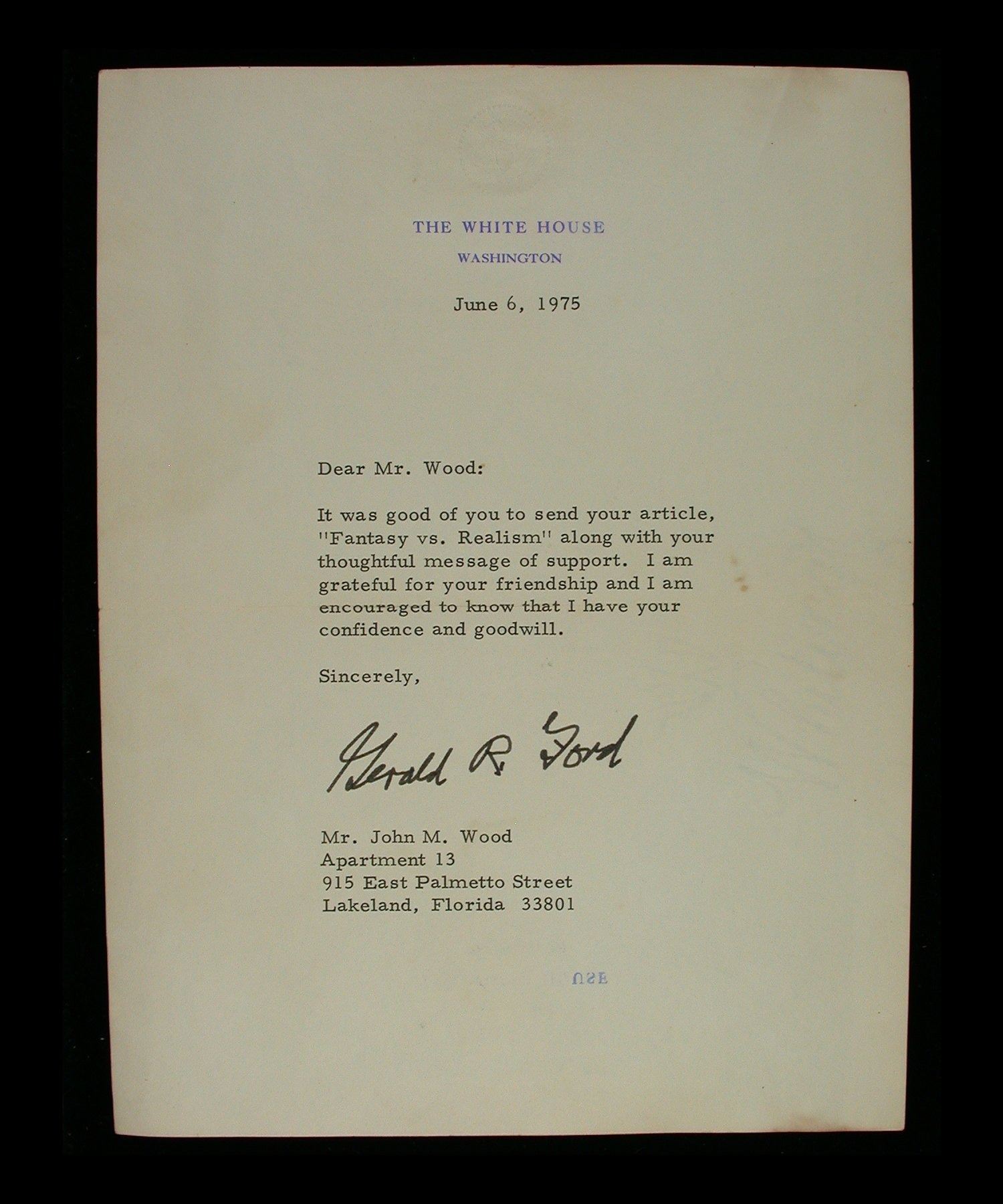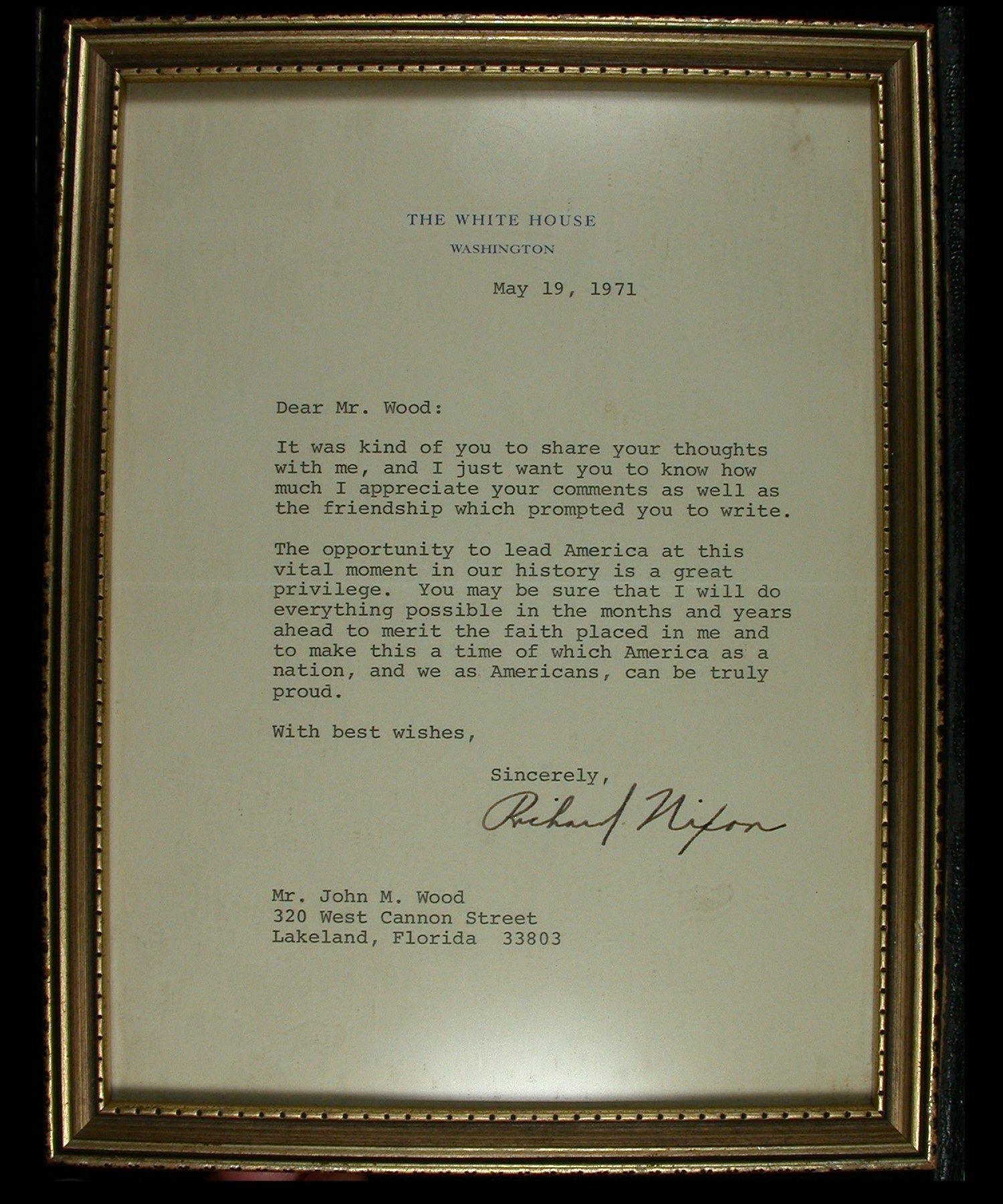 An interesting pair of typed letters on 17 x 22cm White House stationary, consisting of: framed May 19, 1971 letter from Richard Nixon, seemingly responding to a letter of congratulations on the President's inauguration; together with an unframed June 6, 1975 letter from Gerald R. Ford, also seemingly in response to a letter of congratulations. Both addressed to a John M. Wood of Lakeland, Florida, with signatures presumably pre-printed, although Nixon's looks somewhat more original. An interesting pair of items from U.S. political history