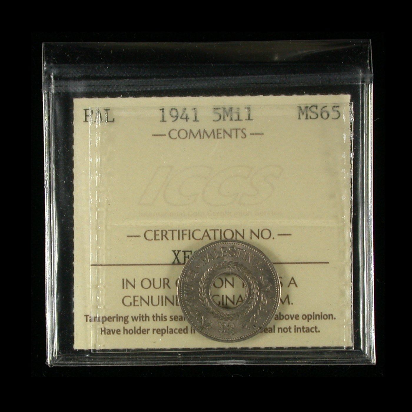 Palestine 5 Mils of 1941 (KM.3), ICCS MS-65 and a scarce grade for the year