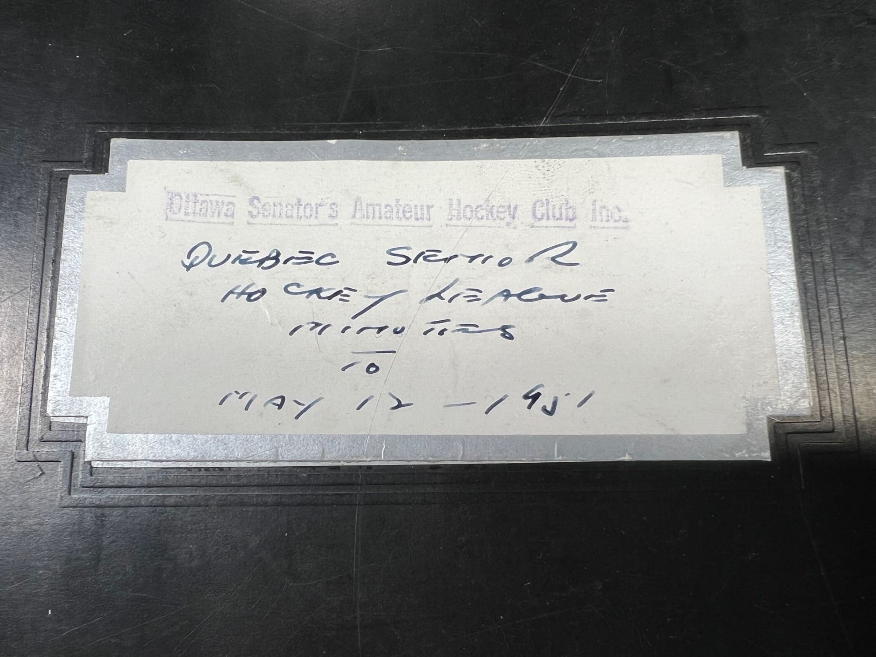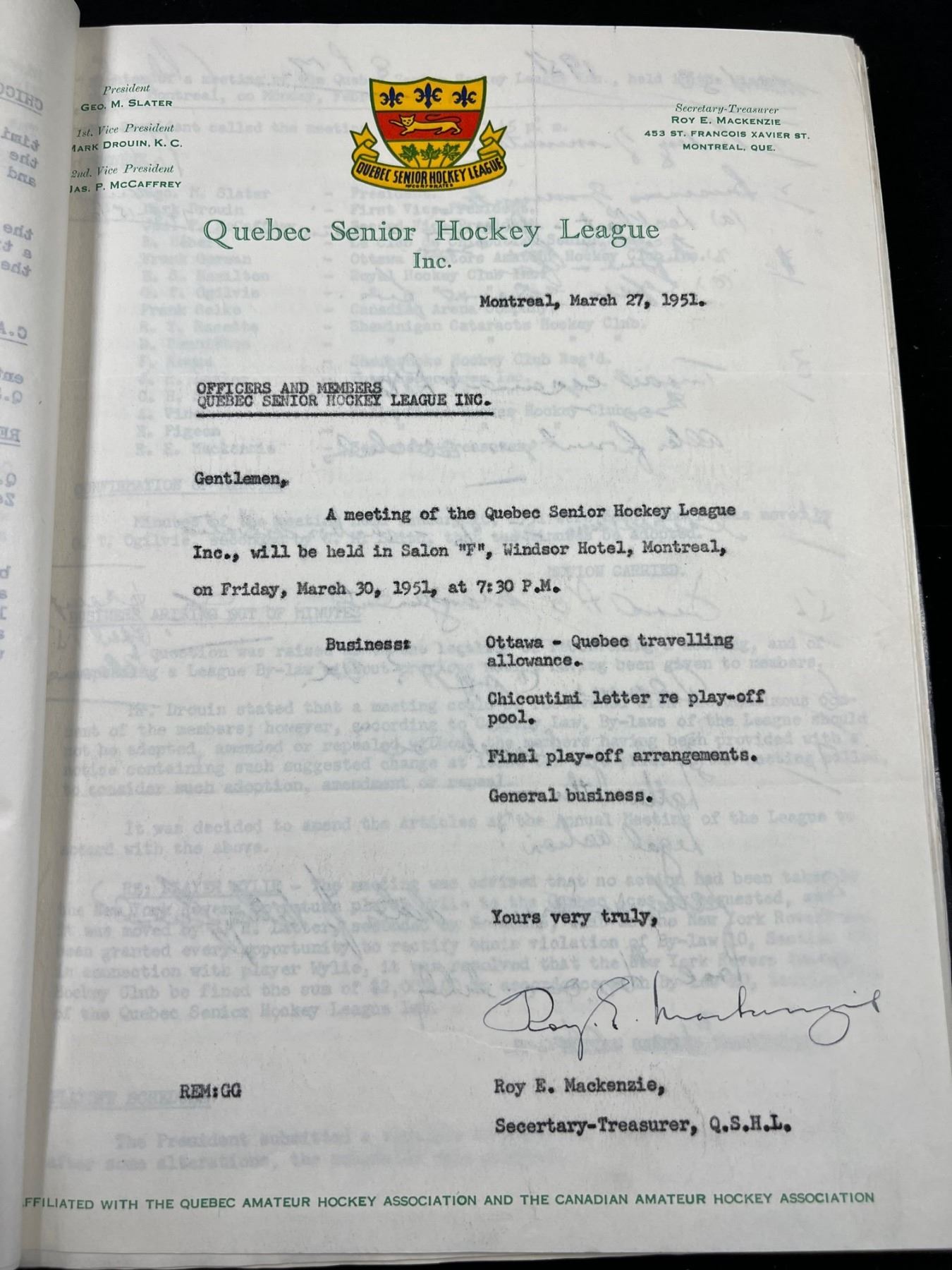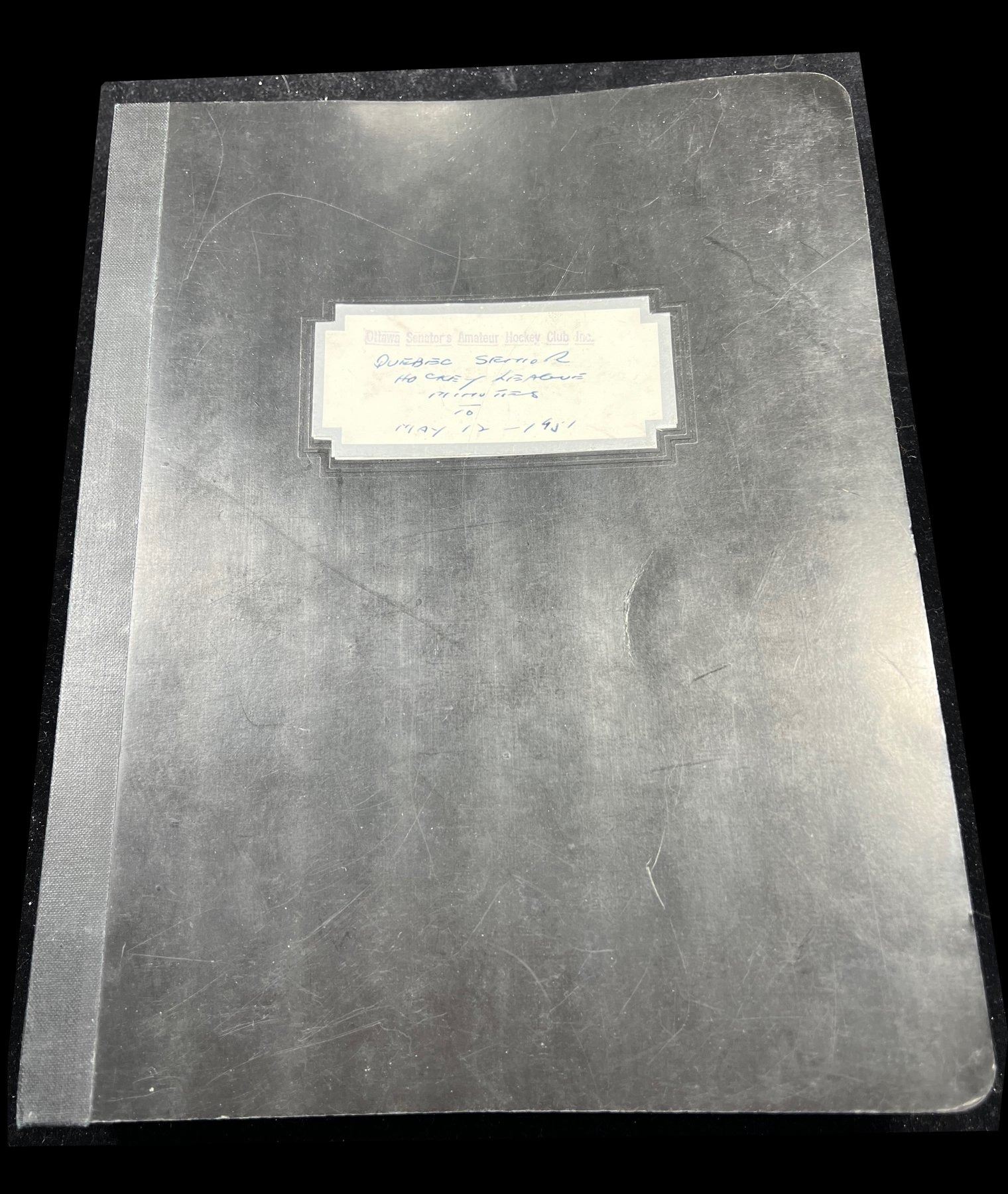 A fascinating archive consisting of more than 200 typed pages of minutes from the Quebec Senior Hockey League (with typed "Ottawa Senators Amateur Hockey Club Inc." printed on the folder's cover label), including signed reports from the AGM's of the period, etc. With extensive detail on the operations of hockey development in central Canada during the period, and a most interesting observation of how the league adapted during the war years in terms of manpower and involment/support of the war effort. Notes from the May 8th, 1942 annual general meeting held at the Windsor Hotel in Montreal, offer perhaps the first written reference to a new trophy being offered to the league by Lady Byng of Vimy, which would of course become the celebrated "Byng Trophy". Those who know the history of Canadian hockey far better than us will no doubt recognize the names of numerous hockey luminaries among the hundreds of pages contained within the covers of this black folder. A unique opportunity for any enthuisiast and/or researcher of the sport.