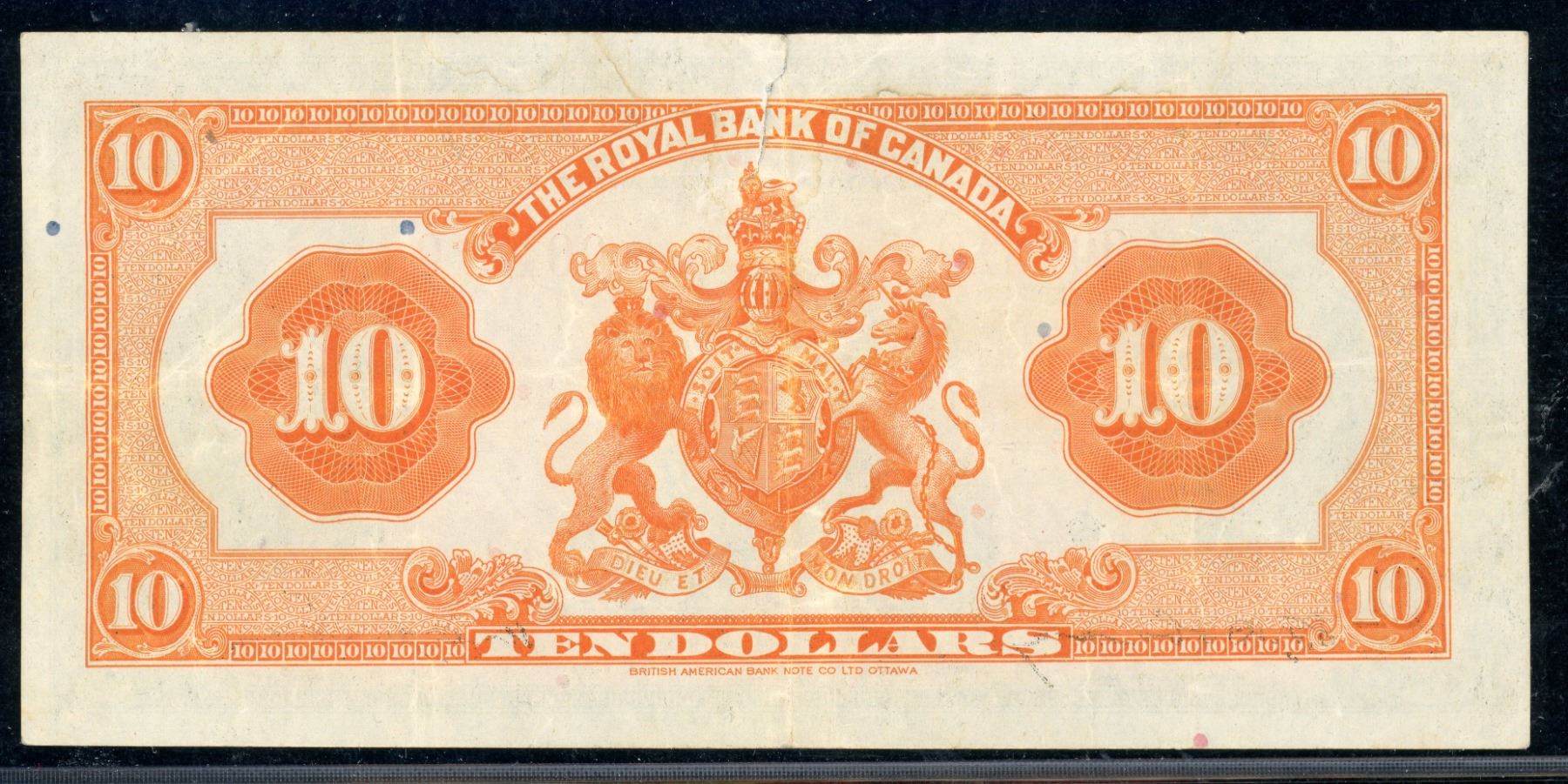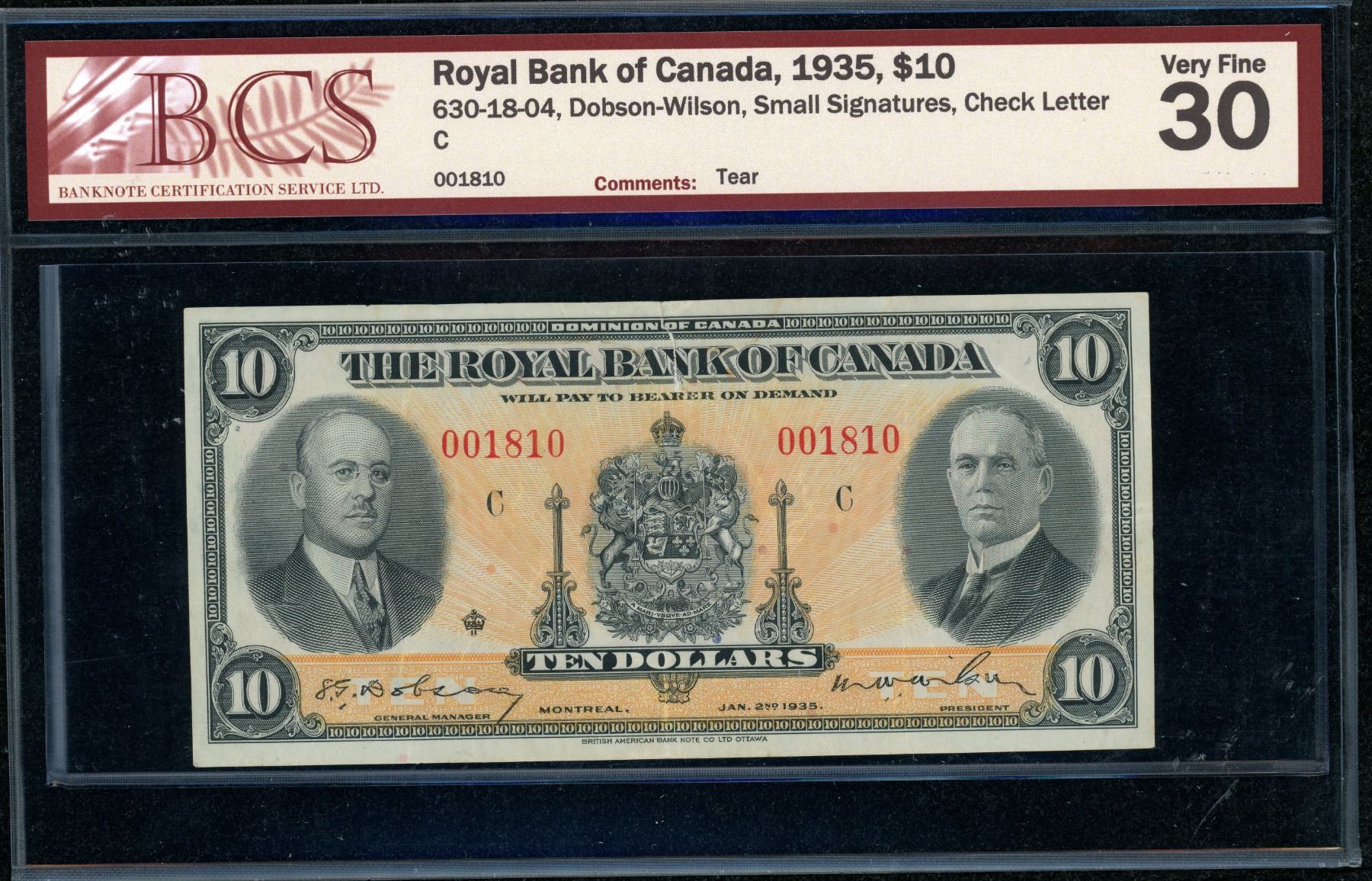 Royal Bank of Canada Ten Dollars 1935, Dobson-Wilson, Small Signatures (Ch.630-18-04), BCS VF-30, Tear; a nice fresh note with visible tear at center-top