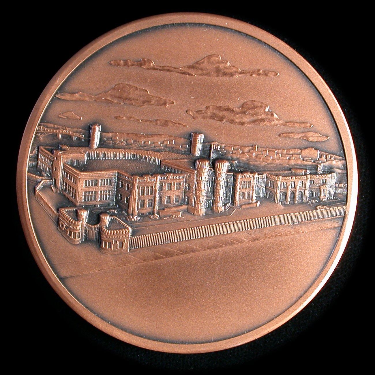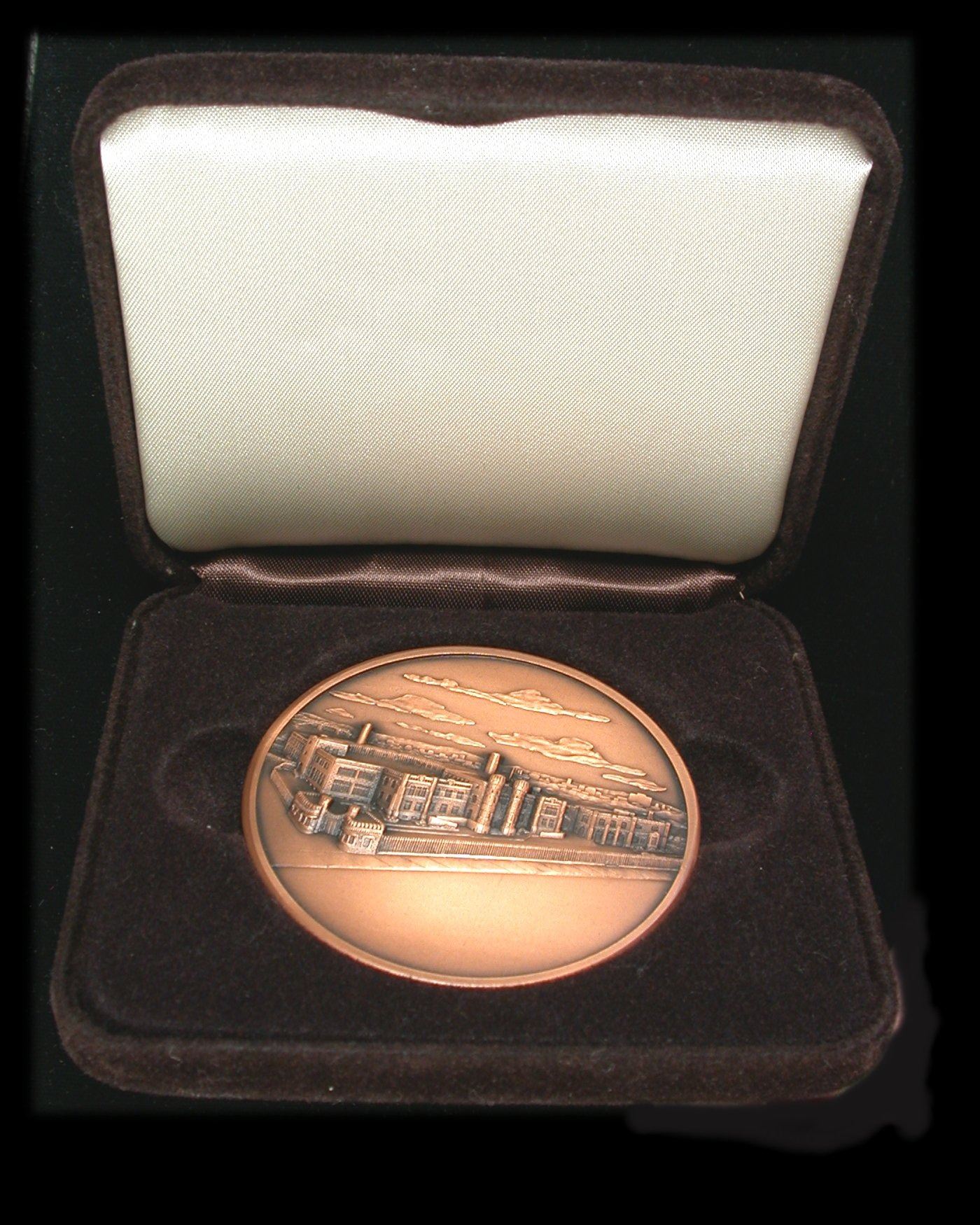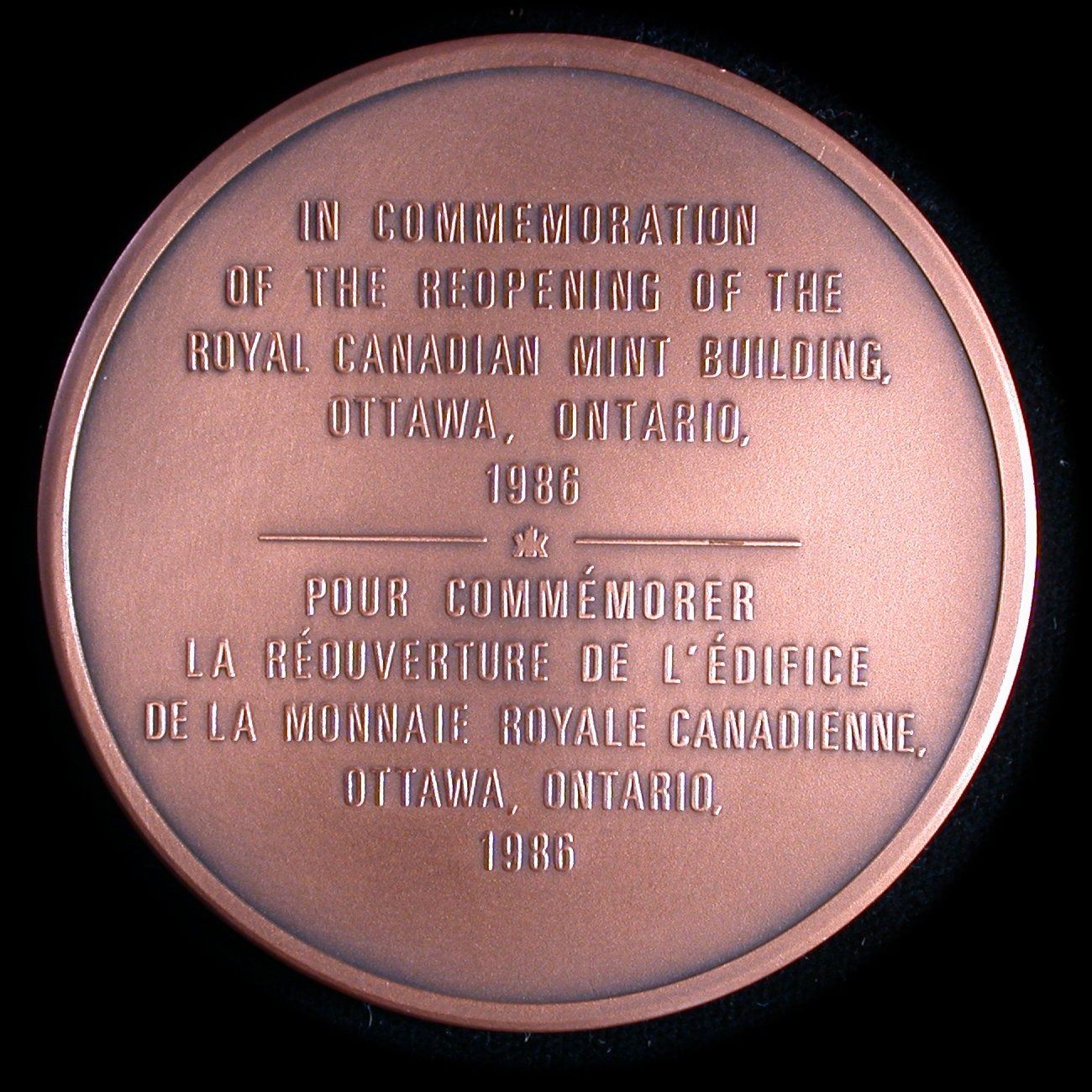 A 60mm, 121.9 antiqued bronze medal, issued by the Royal Canadian Mint to commemorate the 1986 reopening of their main Ottawa facility. In original brown box of issue, and believed issued to RCM staff, and not for general sale to the public