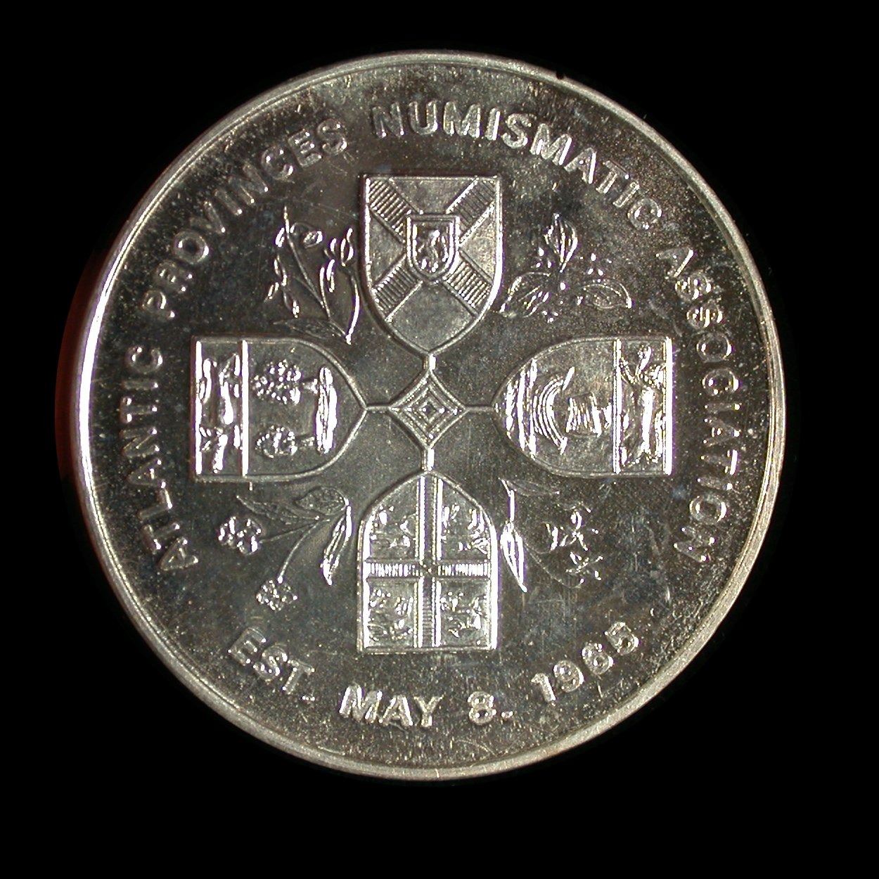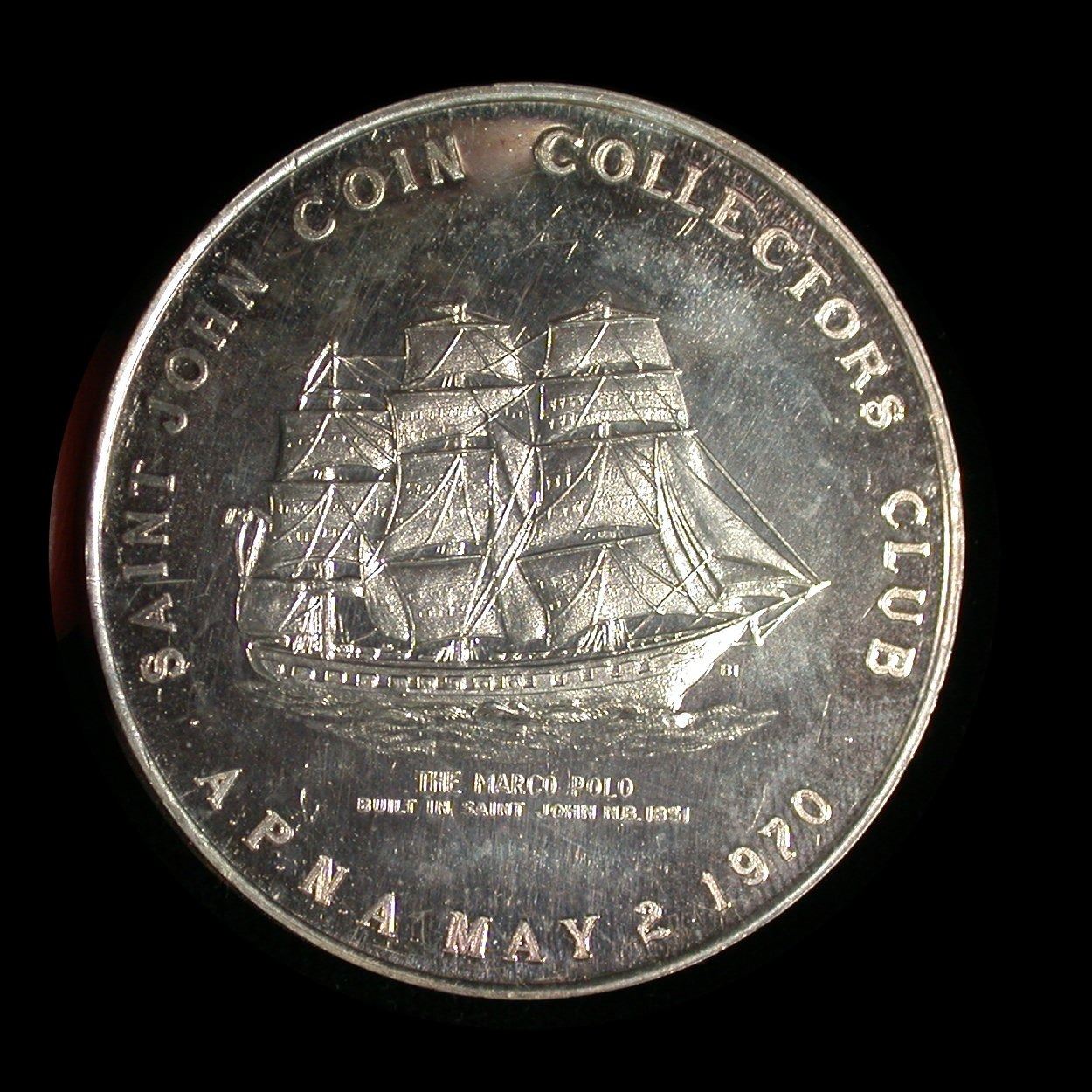 A 40mm, 34.8 gram medal in .999 Silver, issued by the Saint John Coin Collectors Club in 1970 in support of the Atlantic Provinces Numismatic Association. Obv: APNA 4-shield crest at center, text around upper rim: "Atlantic Provinces Numismatic Association", Rev: Marco Polo sailing ship at center, text around rim above: "Saint John Coin Collectors Club", and at bottom: "A.P.N.A. May 2, 1970". Edge-impressed either "68" or "89" depending on your perspective. Lightly-toned UNC, with a few minor hairline scratches on reverse. (This item is HST exempt)