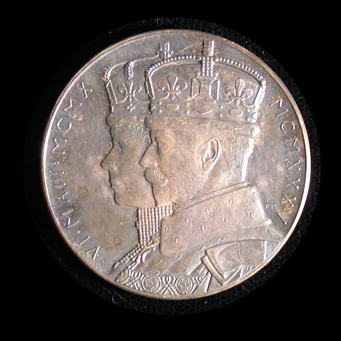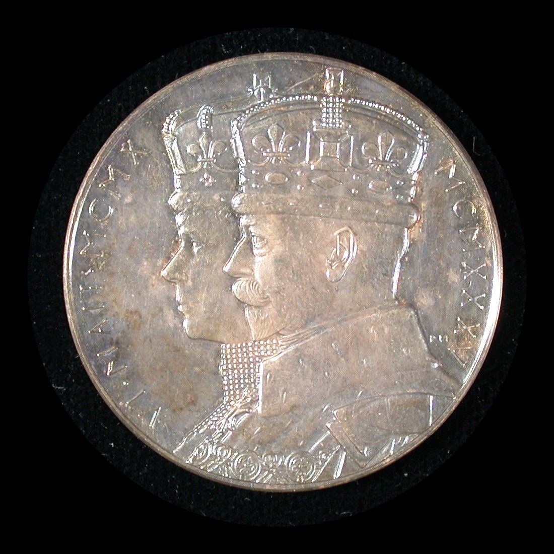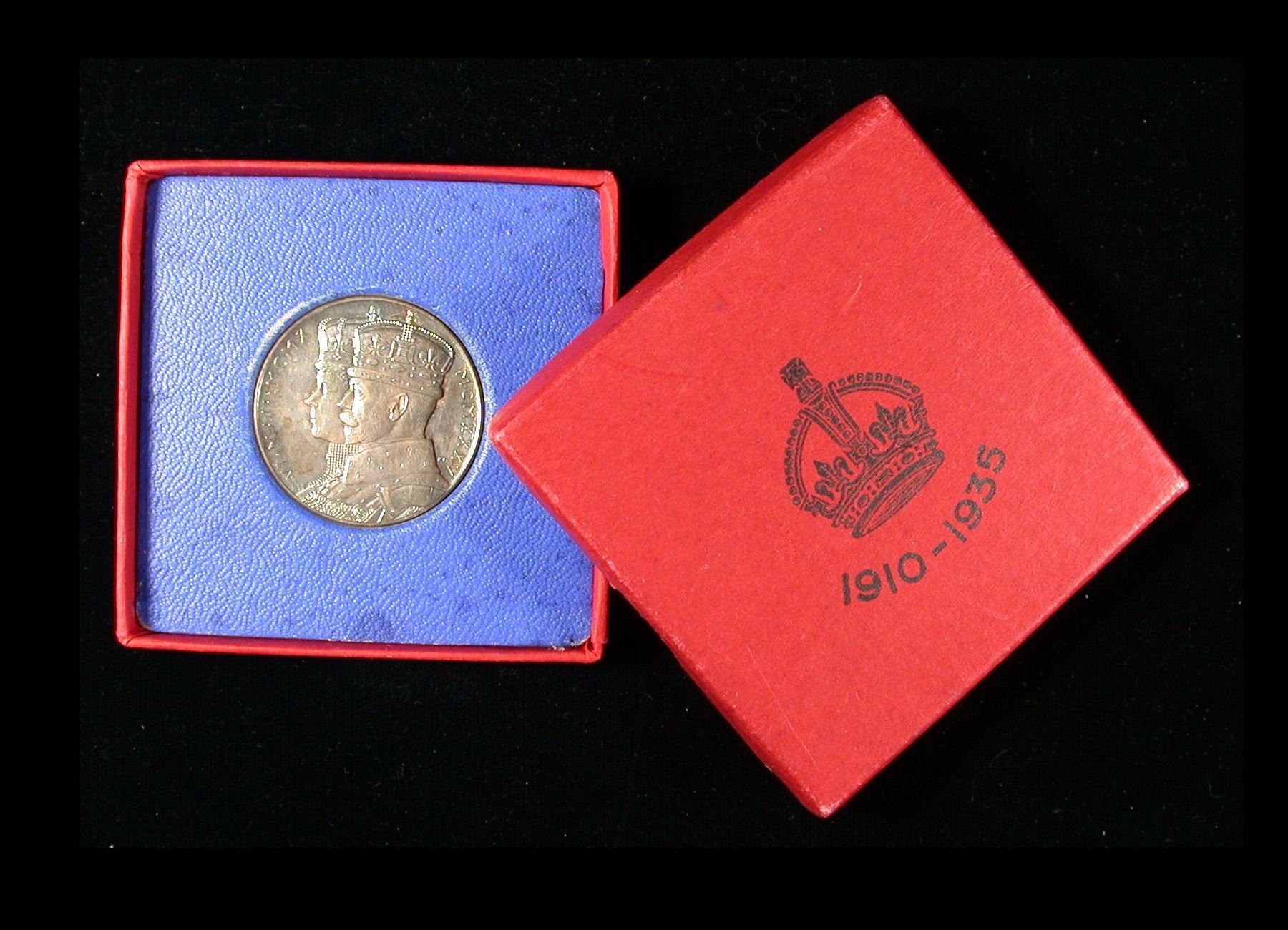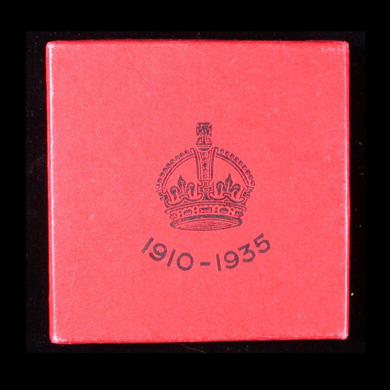An official 32mm Silver Jubilee Medal of George V and Queen Mary, Silver striking, left-facing conjoined portraits on reverse, Windsor Castle on obverse. An especially pleasing UNC example with multi-hued toning, housed in fresh red box of issue