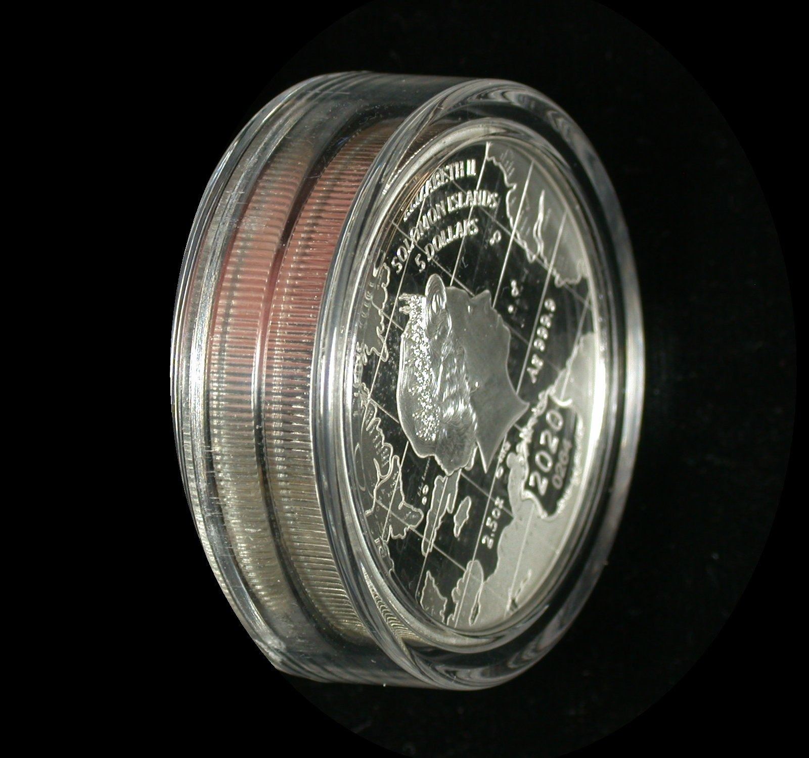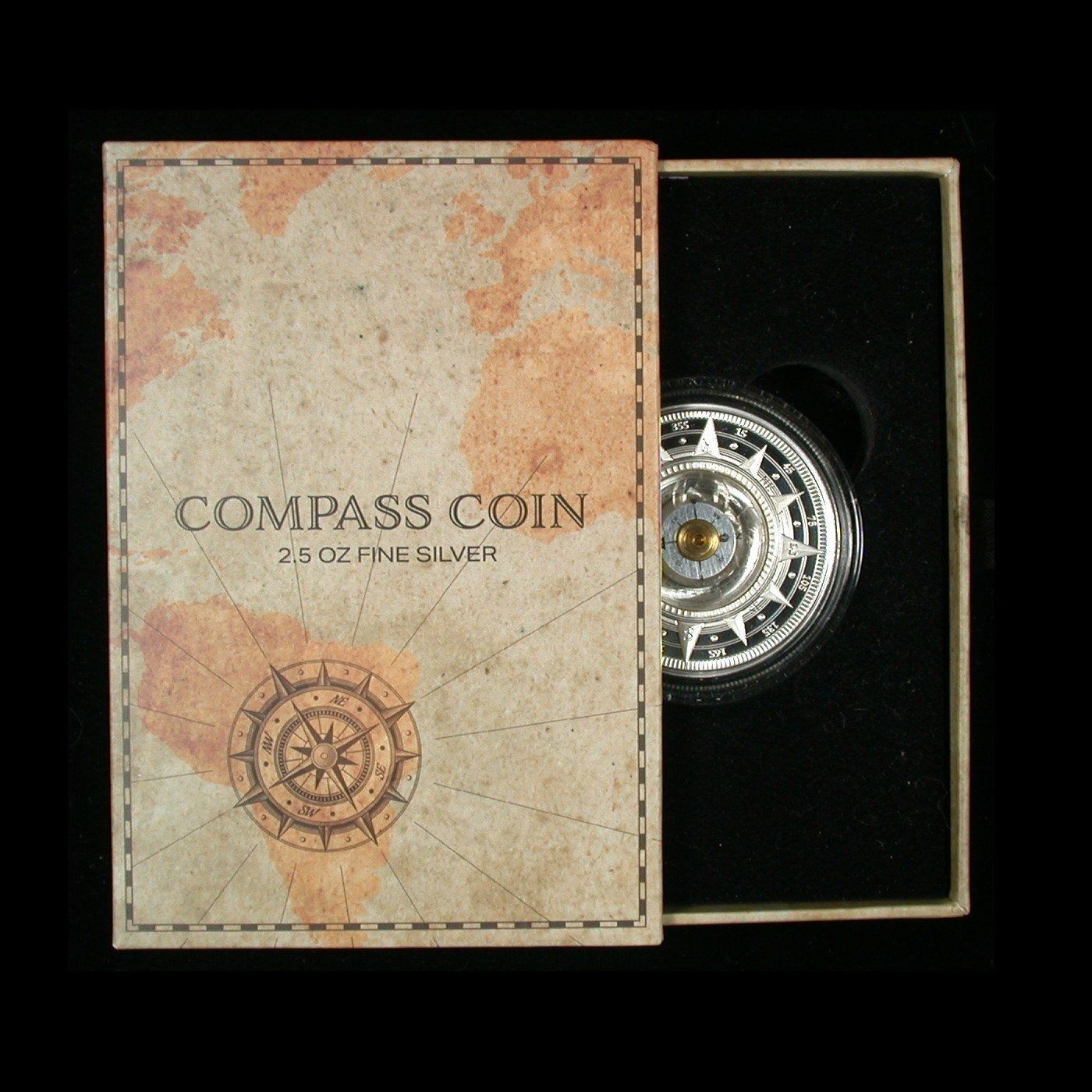 A unique 2020 Five Dollar coin of the Solomon Islands, struck by PAMP of Switzerland in Proof .999 Silver, and housing an actual functioning compass! An exceptionally thick issue containing 2.5 oz of pure Silver, with obverse portrait of Queen Elizabeth set against a map of island nations. Originally offered in Canada through the Royal Canadian Mint, and a sought-after coin that consistently sells for $500+. NOTE: no guarantee is offered for the accuracy of the compass! (this item is HST-exempt within Canada).