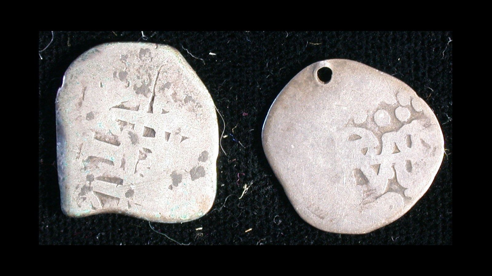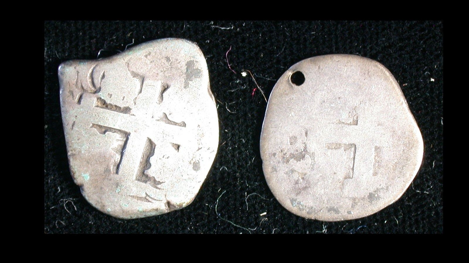 A pair of Spanish-American Silver "Cob" Coins, late 17th to early 18th centuries, as follows: Half Real, 1.2 grams, small hole near rim, cross partially-visible; together with a One Real, 2.5 grams, good outline of cross. Both well-worn Abt.Good, and a neat pair from the great age of sail. (Lot of 2 coins)