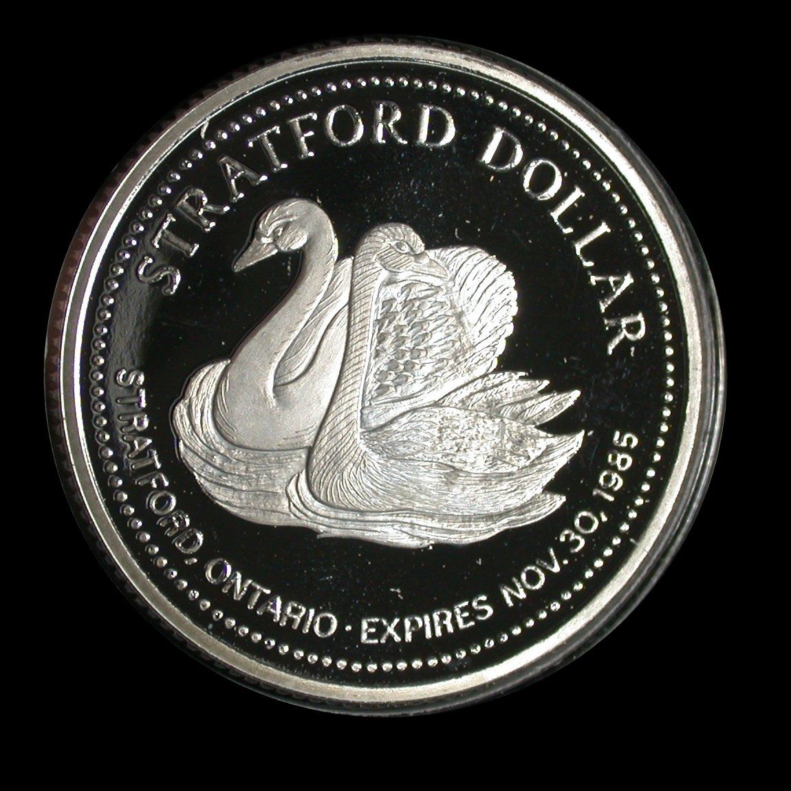A One Dollar Municipal Trade Dollar Token of Stratford, Ontario, dated 1985 with pair of Swans at reverse center, Proof .999 Silver issue with nice cameo detail. (This item is HST exempt)