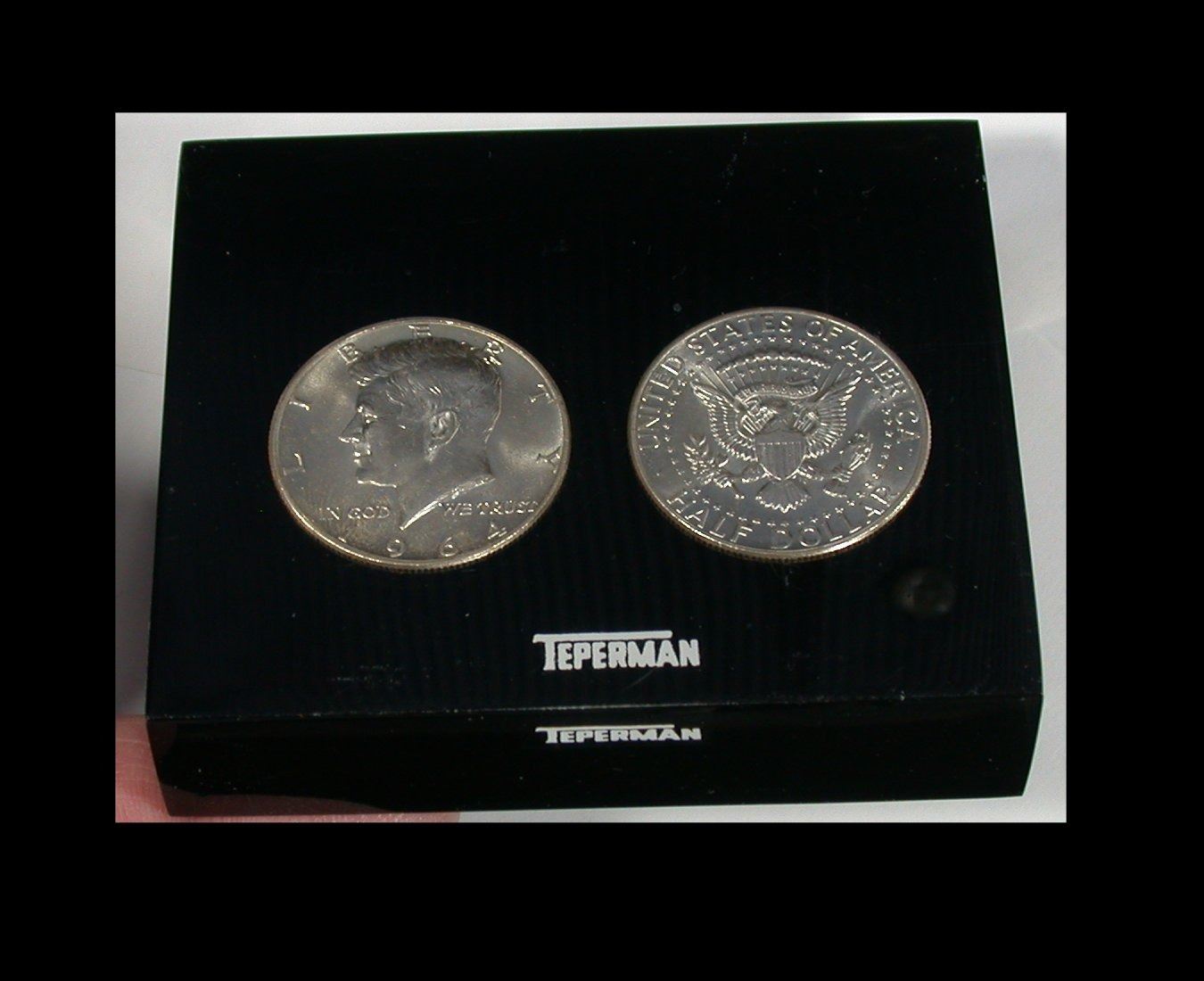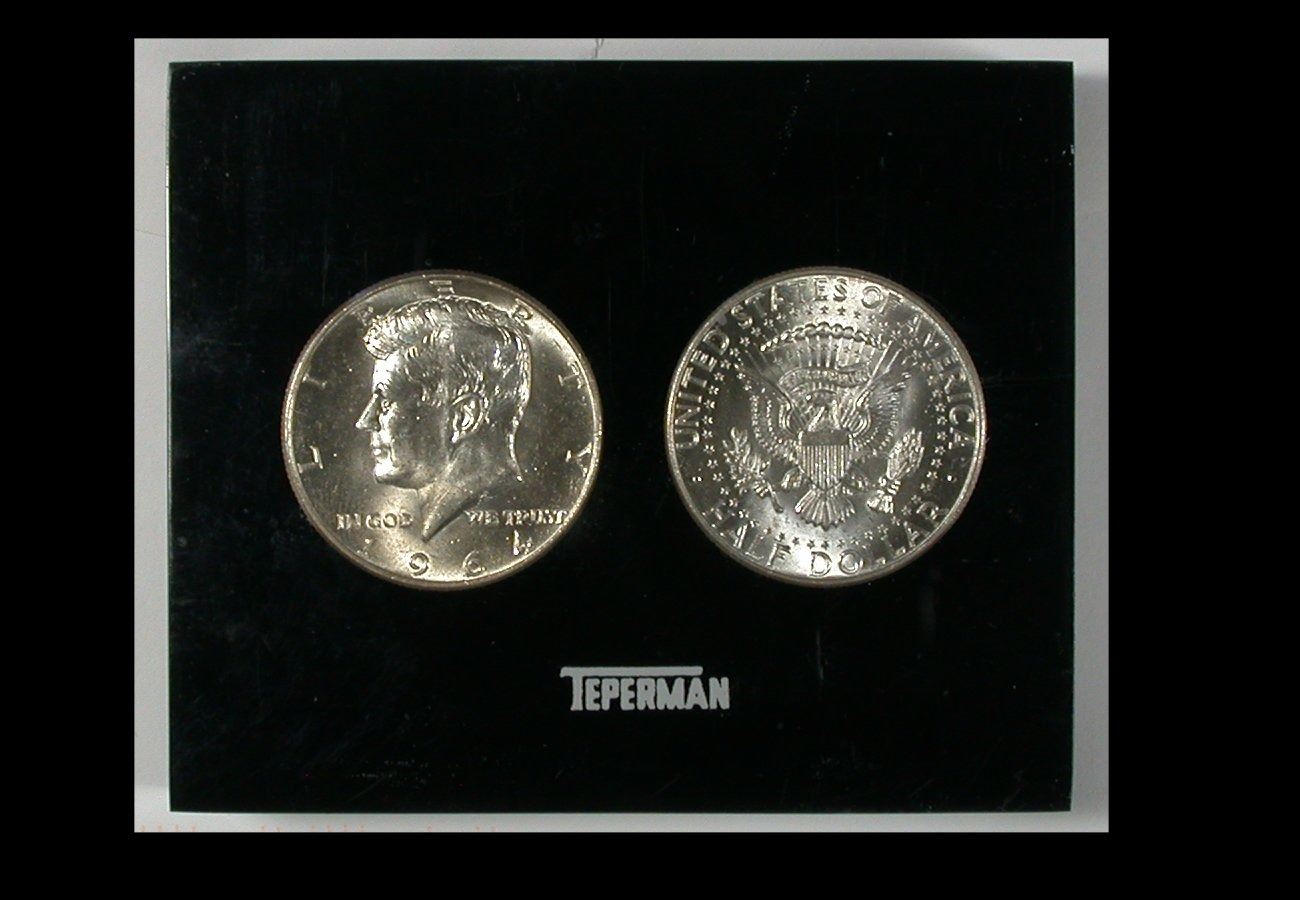 A pair of 1964 United States Silver Kennedy Half Dollars, encased in an 84 X 70 mm clear lucite block with black base, with white lettered logo/name of "Teperman" below coins. Teperman Demolition and Recycling continues to operate out of Toronto, having first been founded more than a century ago. The U.S. connection is not clear here, although perhaps they have expanded their operations south of the border