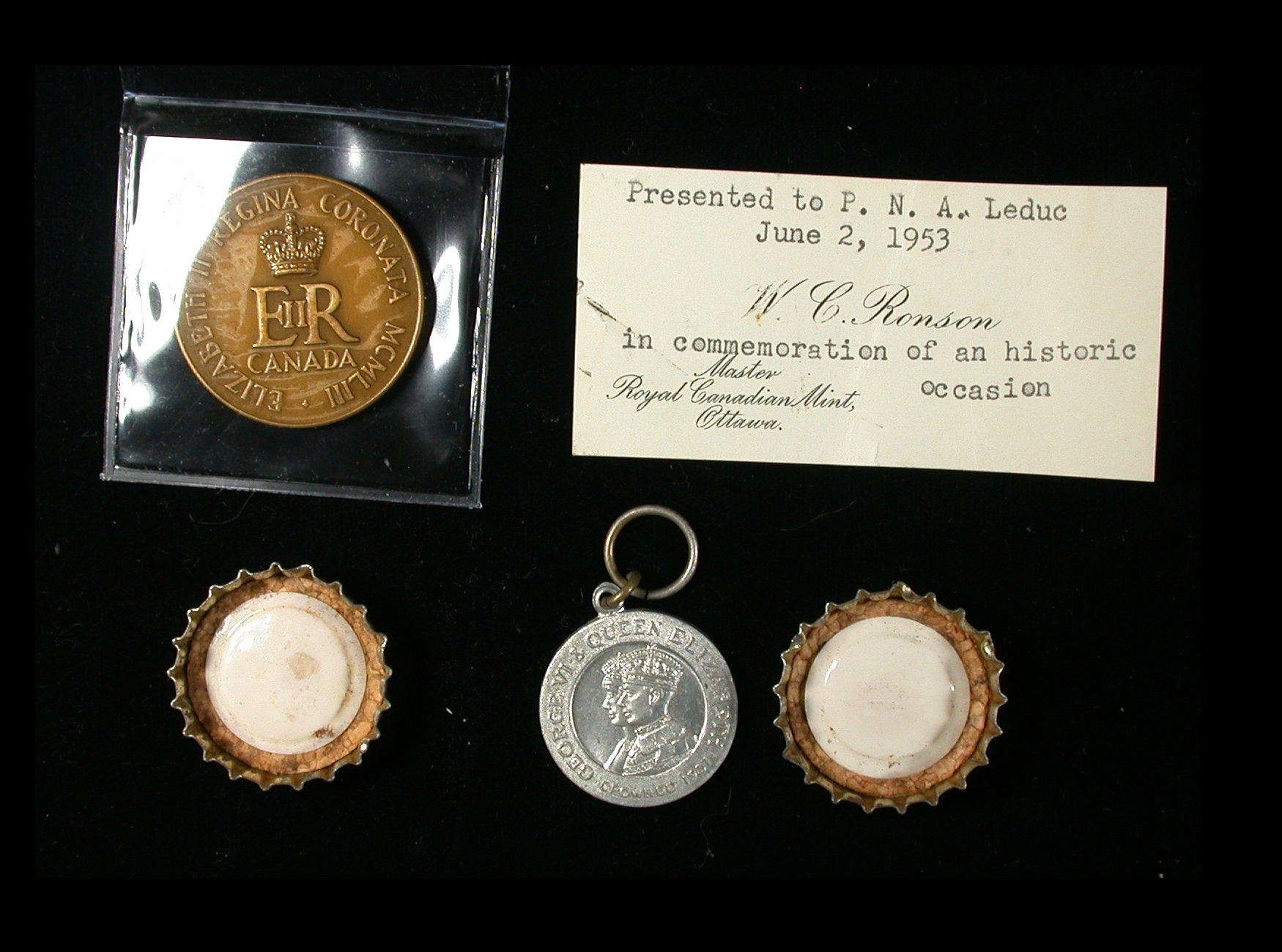 An eclectic trio of Queen Elizabeth medalic items, as follows: 27mm aluminum Coronation Medal fo 1937, conjoined left-facing portraits of King George VI and Queen Elizabeth on front, right-facing portrait of the child Princess Elizabeth at obverse center; together with familiar 32mm bronze Coronation medal for Queen Elizabeth (as distributed to all Canadian school children), partially-lacquered and - interestingly - accompanied by the 7.5 X 3.75 cm calling card of Royal Canadian Mint Master W. C. Ronson, with additional typed note: "Presented to P.N.A. Leduc / June 2, 1953 / IN commemoration of an historic occasion". Offered together with with a matched pair of Canada Dry bottlecaps with full colour portrait of then Princess Elizabeth atop, and white lettering against dark cobalt background "ROYAL VISIT CANADA 1951". A neat lot for the collector of Elizabethen memorabilia. (Lot of 4 items)P