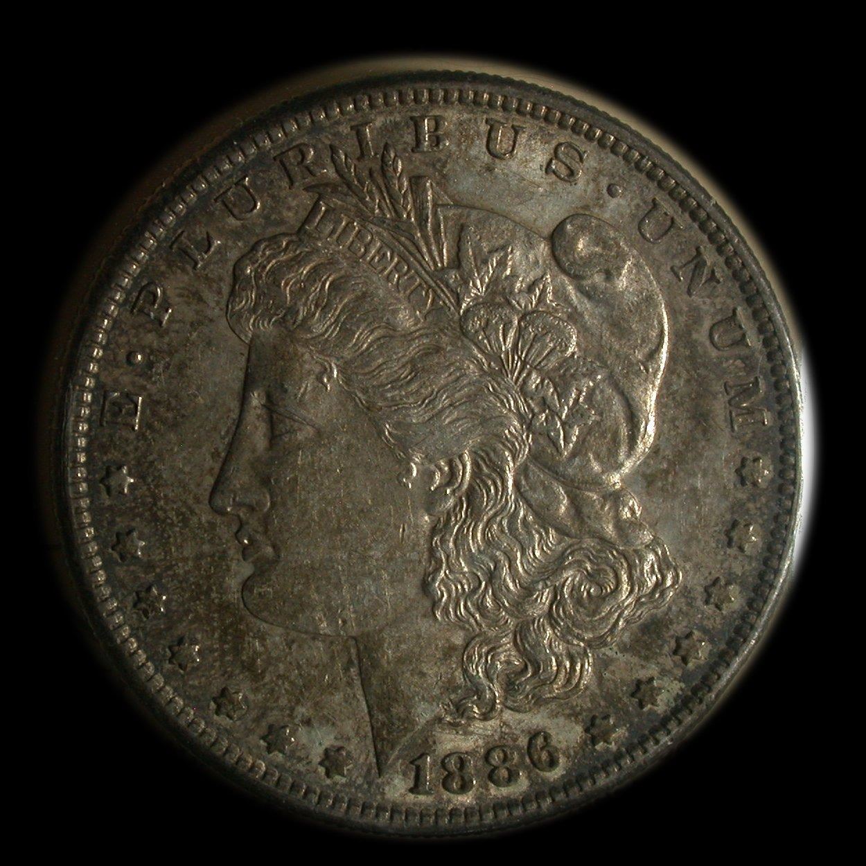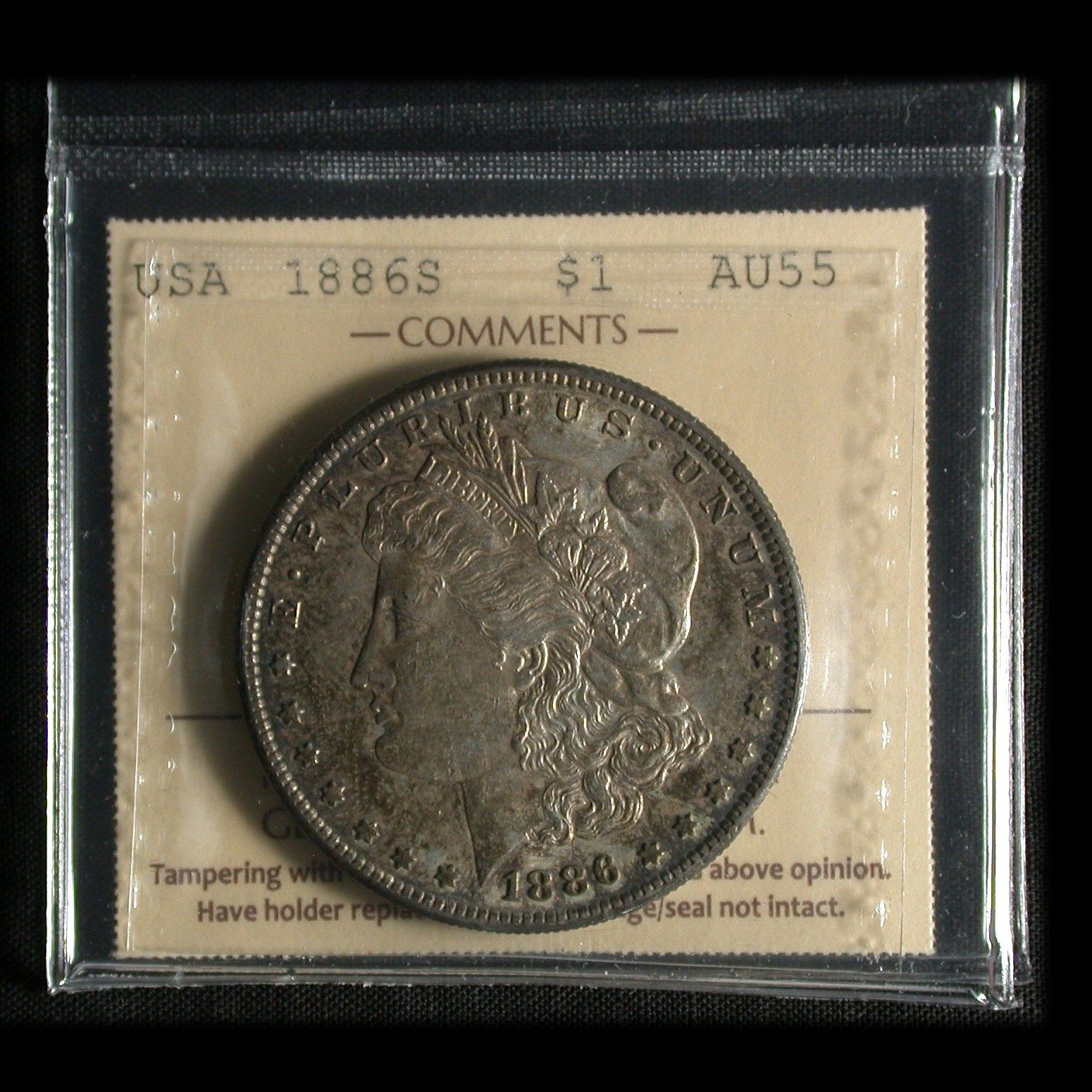 United States 1886-S Morgan Silver Dollar, ICCS AU-55 with medium to dark toning