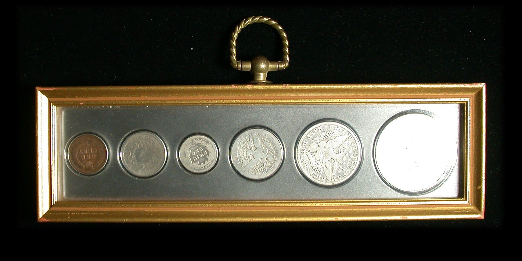 A five-piece set of 1902 United States coinage, "Indian Head" Cent through [1902-O] Morgan Silver Dollar, nicely-matched Good or better, housed first in a plastic year-set holder, and then sealed in a traditional gold-finished wooden frame with suspension ring at top.