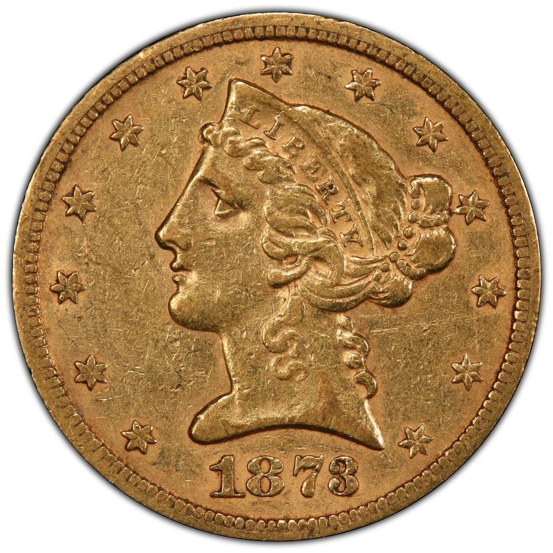 An 1873-S Five Dollar Gold, PCGS AU-50 and a scarcer date in this higher circulated grade