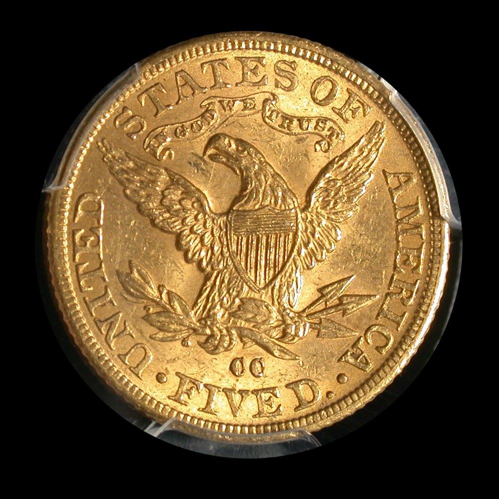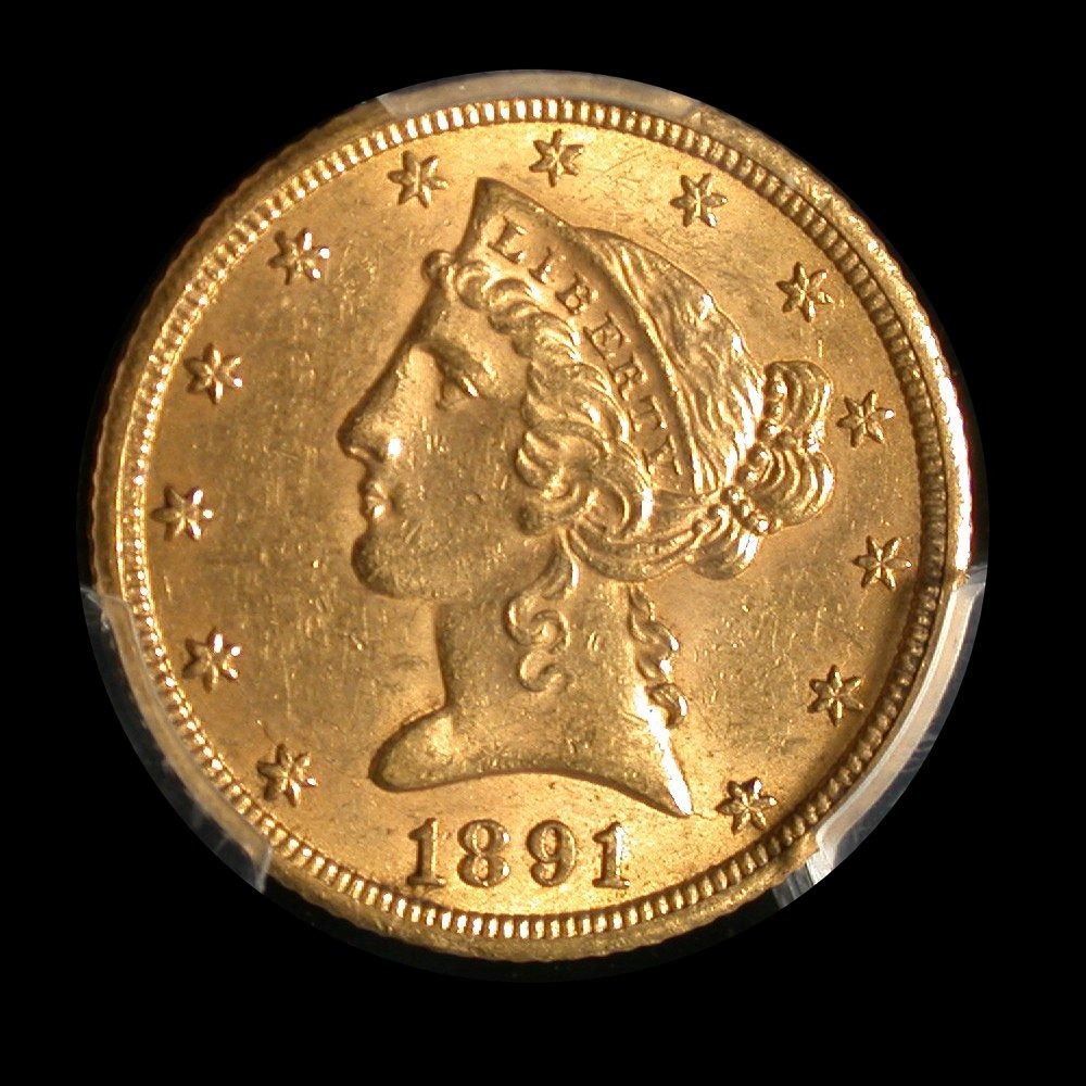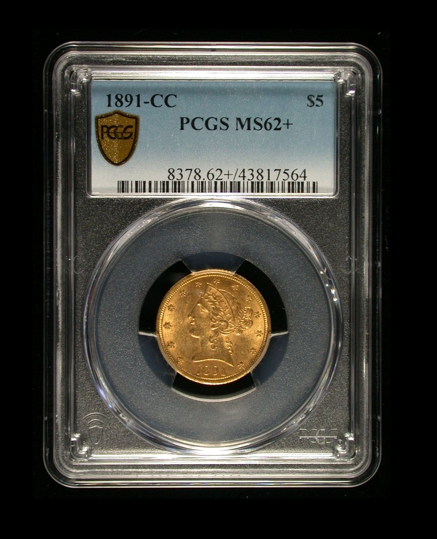 United States Five Dollars 1891-CC, PCGS MS-62+ with decent eye-appeal. The only UNC Carson City gold issue we've handled in the past 20 years, and a scarce type-piece for this Nevada branch of the U.S. Mint