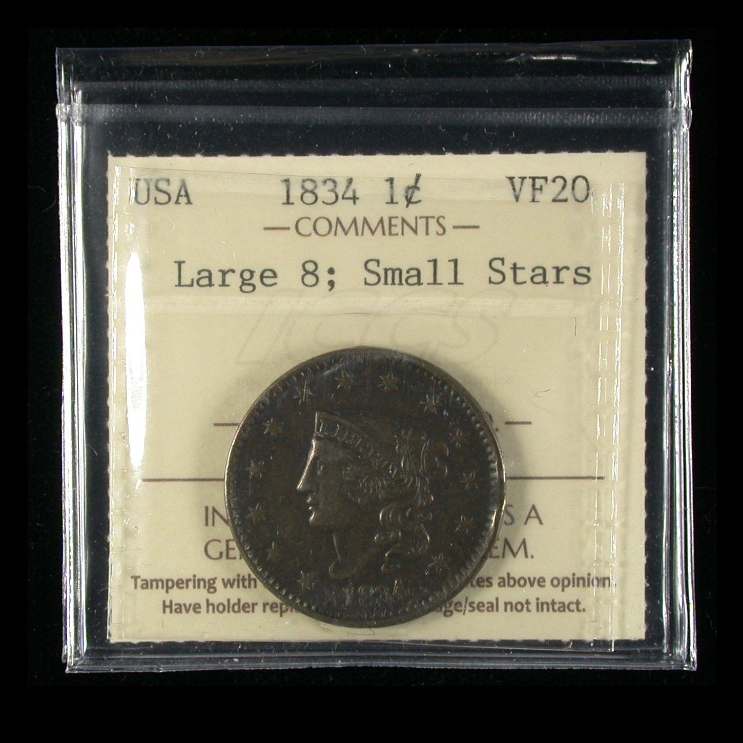 A U.S. Large Cent of 1834, Large 8, Small Stars, ICCS VF-20 with nice 45 degree die rotation