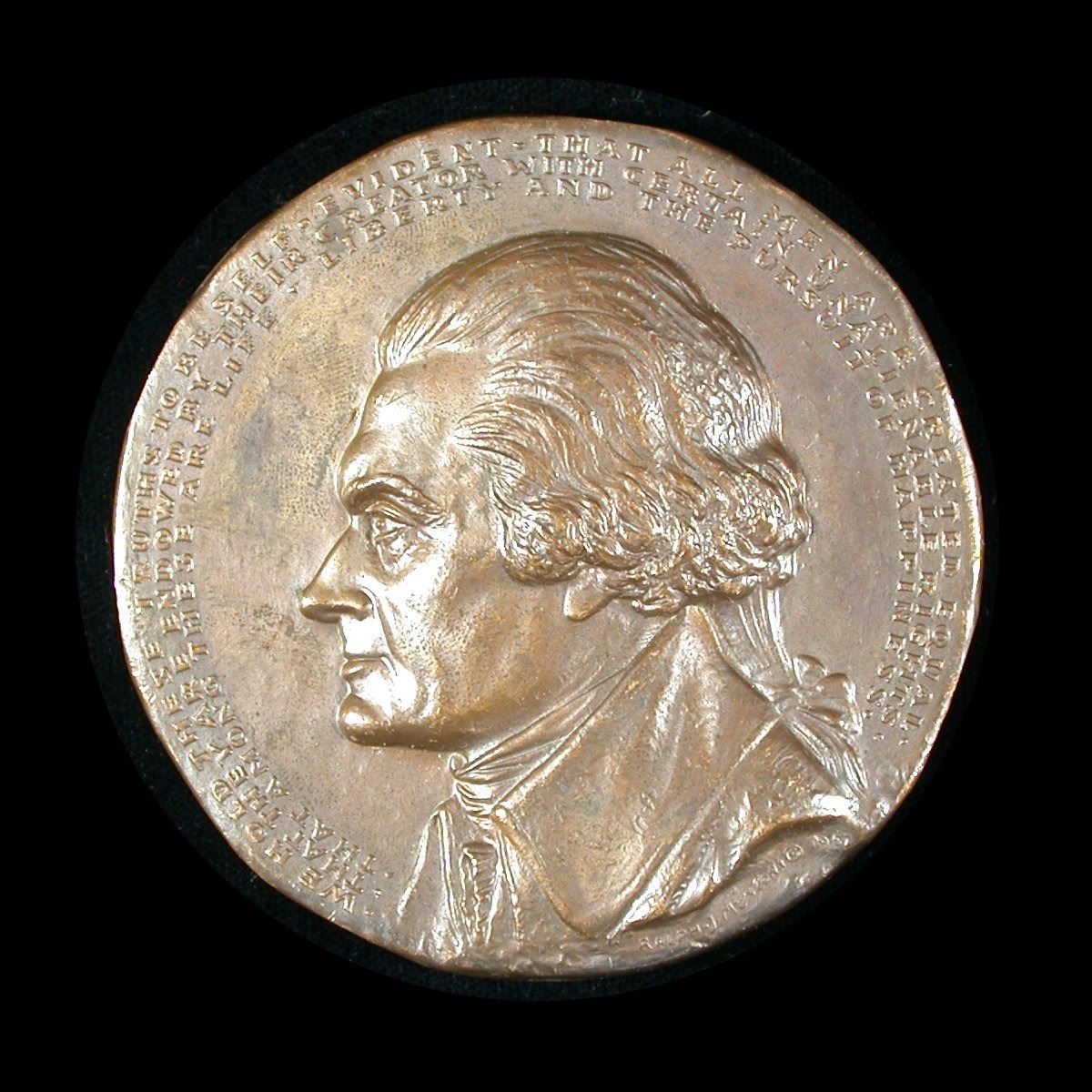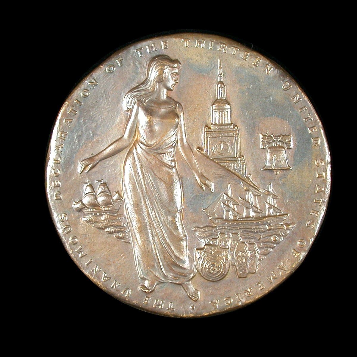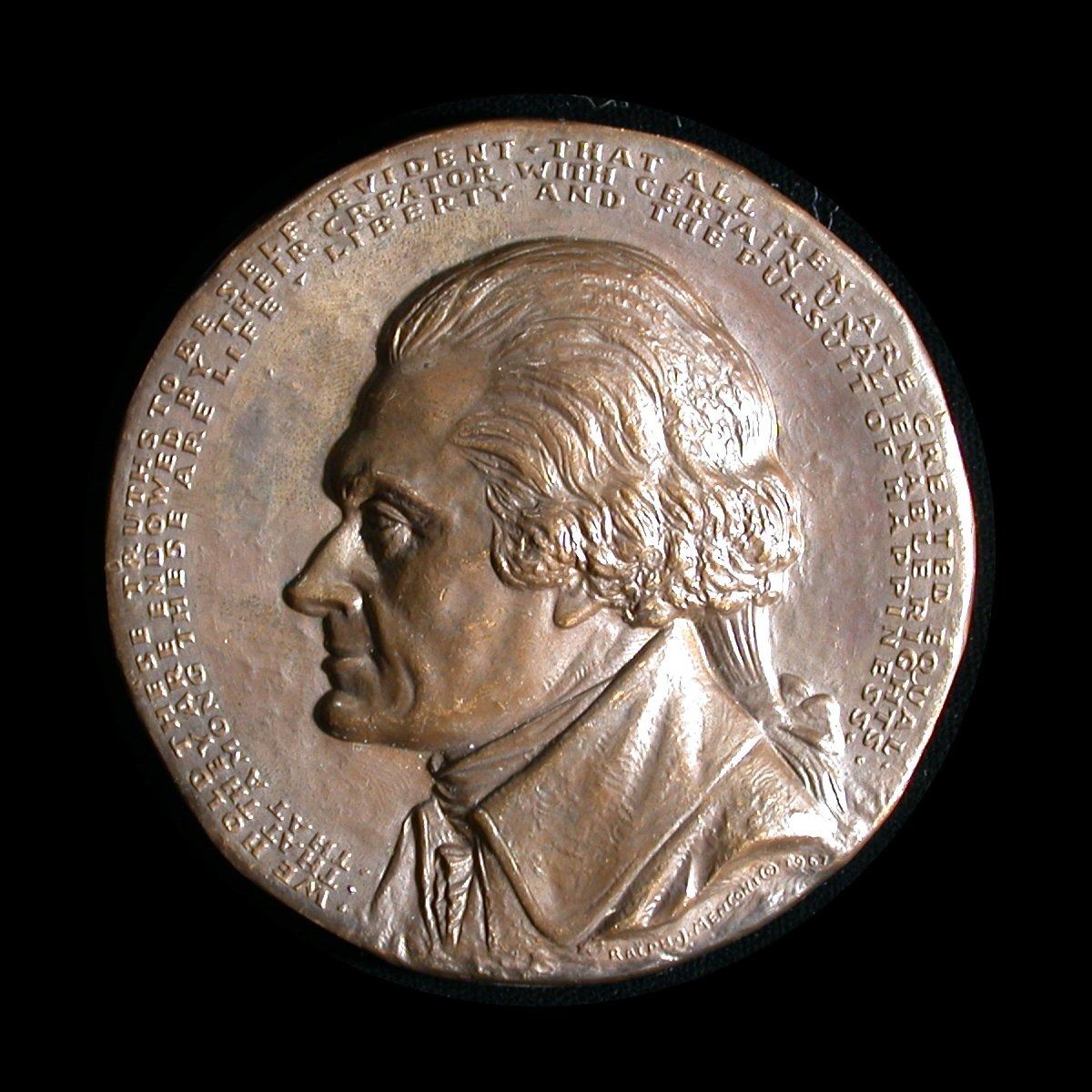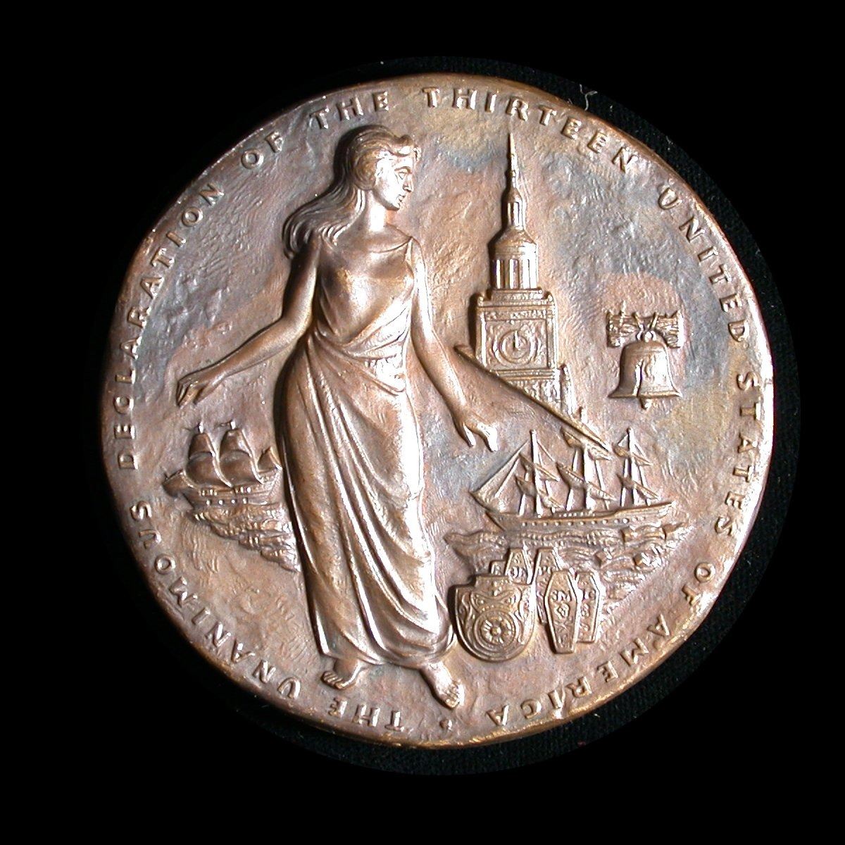 A heavy 72mm, 206 gram bronze medal by Ralph Monconi, struck by Medallic Arts in 1966 to honor the Founding Fathers of the United States, and more specifically, the Declaration of Independence. Rev: left-facing, high-relief portrait of Thomas Jefferson, three small rows of text around upper rim; Obv: Standing Liberty, Hall of Independence, Liberty Bell, etc. Slightly irregular in shape (as issued), AU