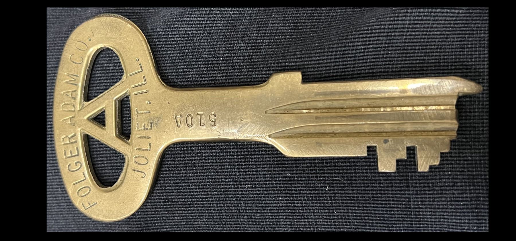 An imposing early brass prison key, 11.5 cm in length, manufactured by Folger Adam Co. of Joliet, Illionois, and used at Toronto's Andrew Mercer Reformatory for Women (demolished in 1969, now the site of Alan Lamport Stadium). Precise age unknown, though presented to its former owner during the demolition of the facility, and likely from the 1930's or 40's.