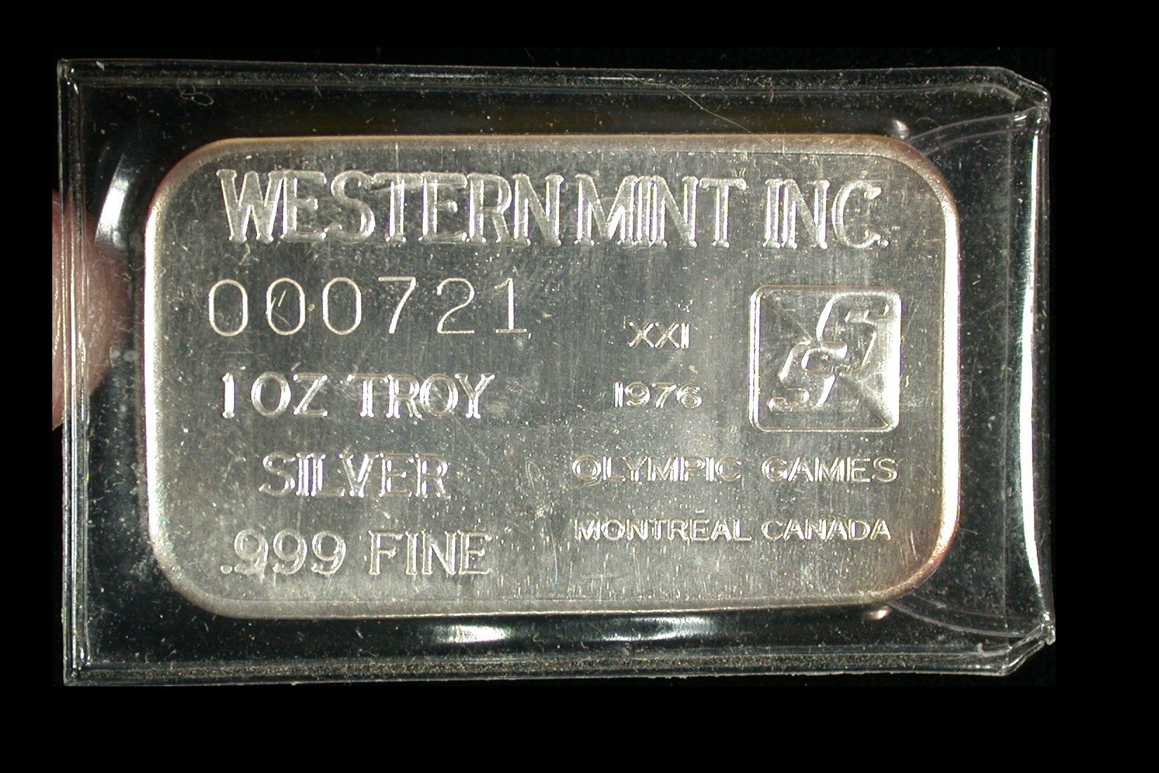 A 1 oz .999 Silver Bar from Western Mint inc., issued to mark the 1976 Olympic Games in Montreal. Uniface, with serial #000721. UNC, still housed in original flip. (This item is HST exempt).