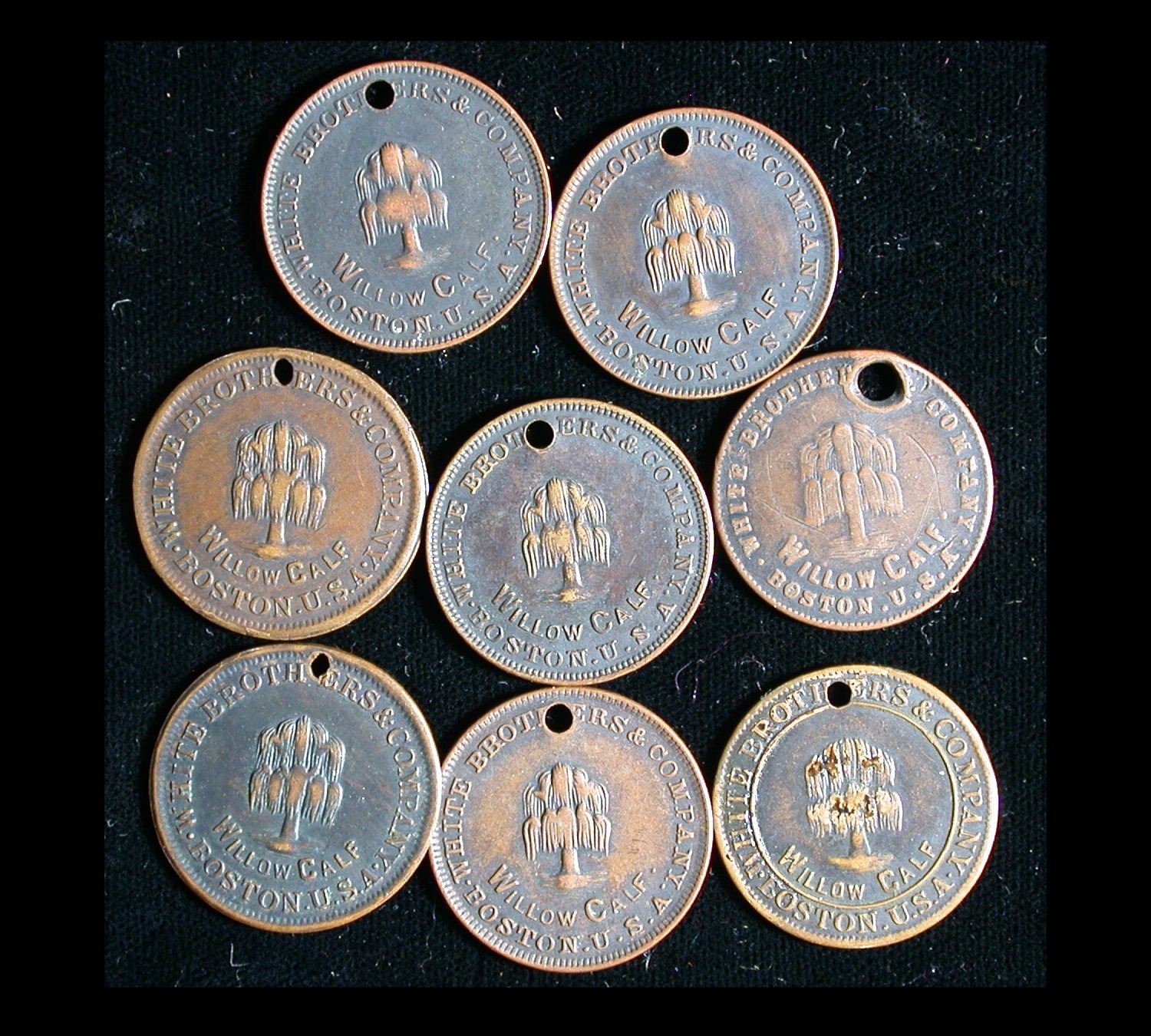 United States, the 25mm bronze "Willow Calf [leather]" Token of White Brothers & Company, Boston, early 1900's. Dealer-lot of 8 pieces, with at least three different dies (including one example with ring encircling tree).
